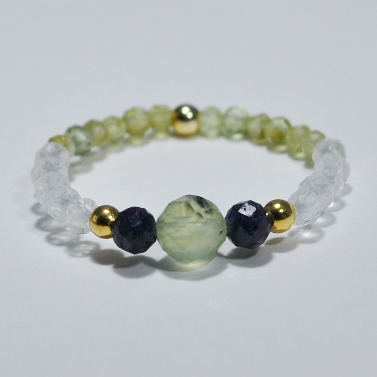 Pierścionek wykonany z naturalnych kamieni: zielonego frenitu i oliwinu, granatowego szafiru i przezroczystego kryształu górskiego, ozdobiony pozłacanymi srebrnymi kuleczkami próby 925. Kamienie w rozmiarze od 2 do 4 mm, umieszczone na delikatnej i elastycznej żyłce jubilerskiej, tworzą wyjątkową kompozycję.