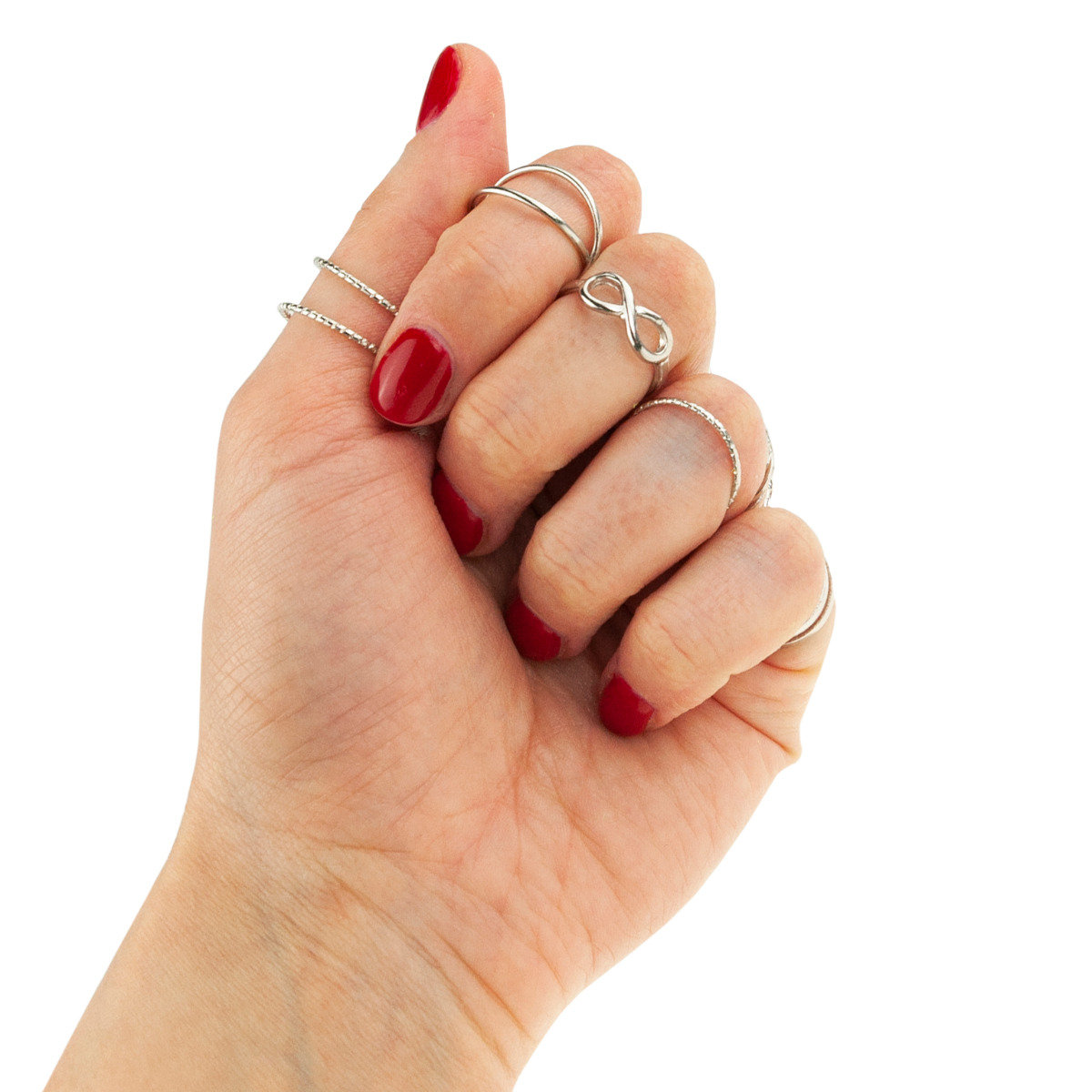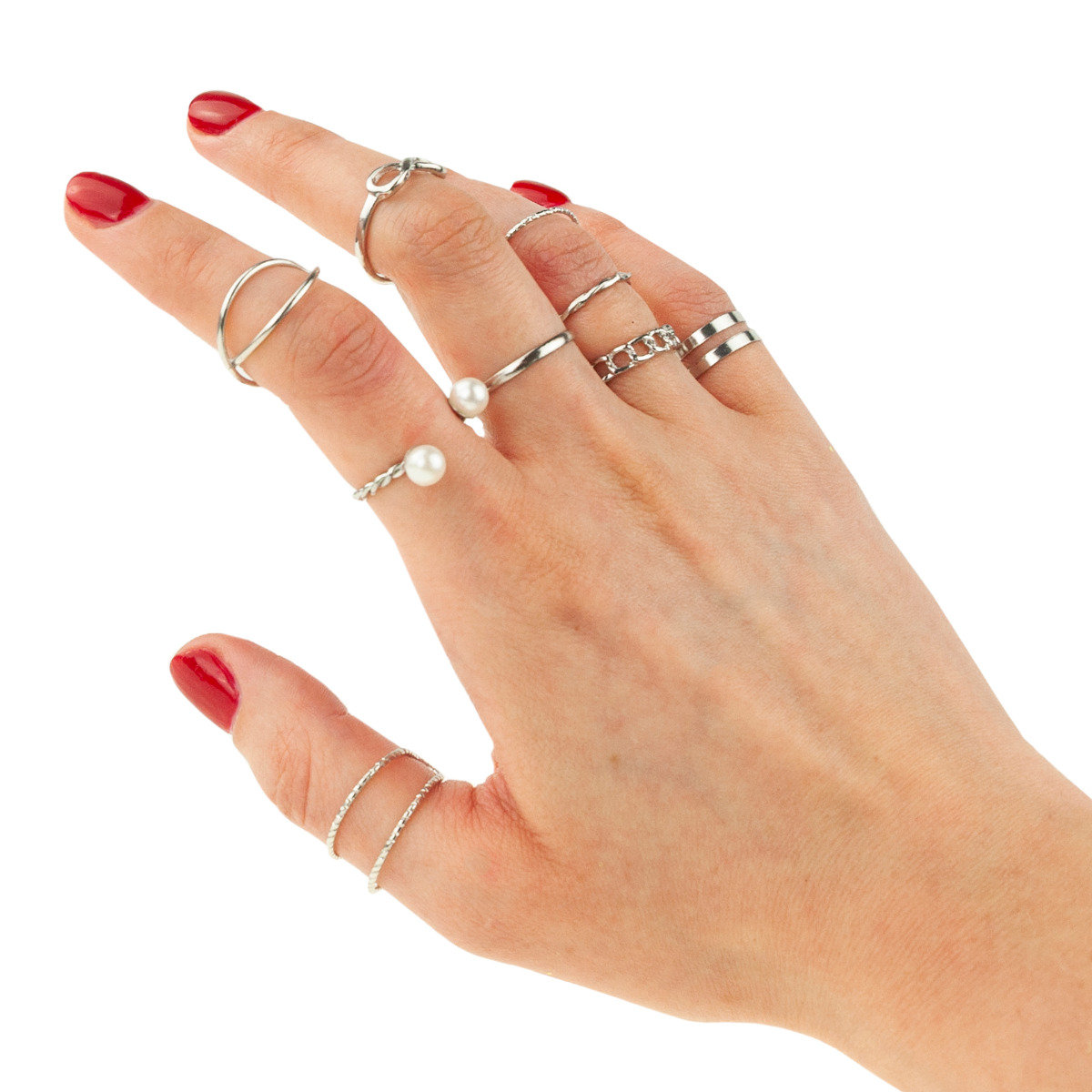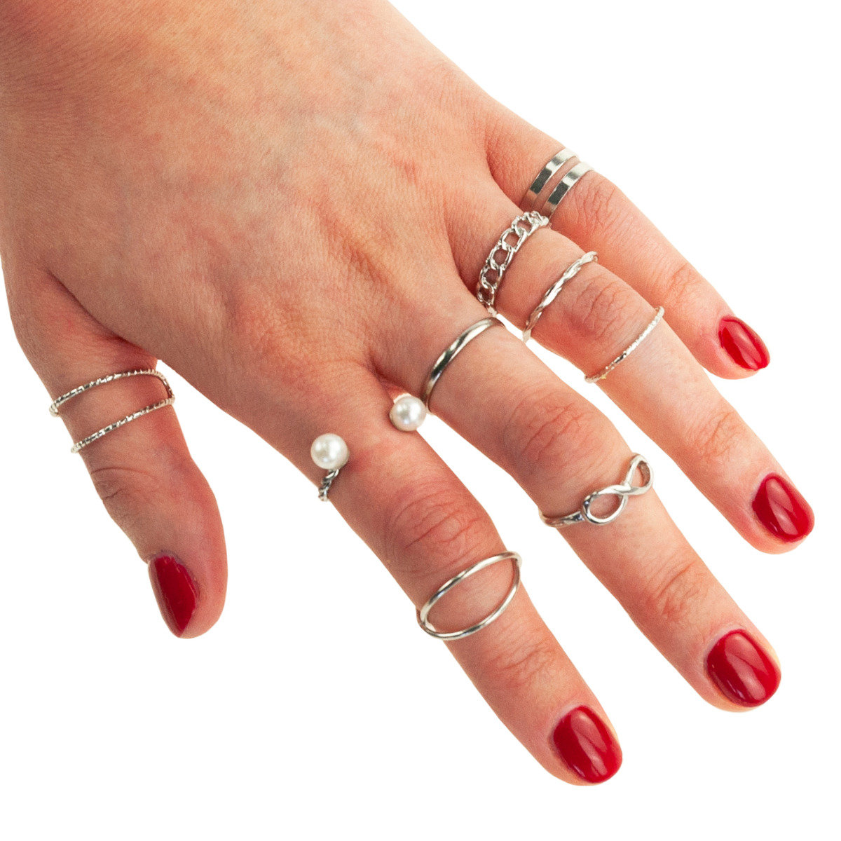 Piękny i elegancki zestaw pierścionków. Idealnie sprawdzą się jako stylowy prezent. W całości wykonane z dbałością o najmniejsze szczegóły, subtelnie podkreślą delikatność kobiecej dłoni. Ponadczasowy, delikatny motyw trafi w gust każdej kobiety. Zestaw składa się z 9 sztuk pierścionków. Możesz nosić je oddzielnie lub wszystkie razem.