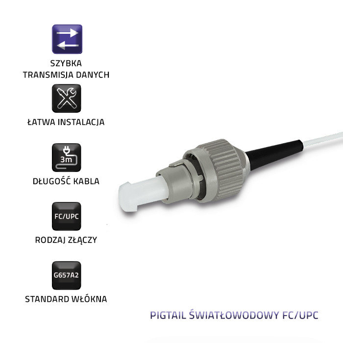 Pigtail światłowodowy przeznaczony jest do przyłączania kabli dystrybucyjnych w przełącznicach i jest jednostronnie zakończony złączem FC/UPC. Charakteryzuje się on niską tłumiennością oraz łatwą instalacją i obsługą światłowodu, a także dużą prędkością transmisji danych. W pigtailu użyte zostało włókno jednomodowe G652D oraz zewnętrzna niepalna powłoka kabla, która podczas pożaru nie wydziela szkodliwych gazów (LSZH). Sygnał w światłowodzie jednomodowym nie rozprasza się, a strumień danych przesyła się równolegle do osi i dociera na koniec włókna w jednym modzie bez odbić. Światłowody jednomodowe są idealnym rozwiązaniem do komunikacji światłowodowej na duże odległości, ponieważ sygnał może być transmitowany bez żadnego wzmacniania nawet do 100 km.