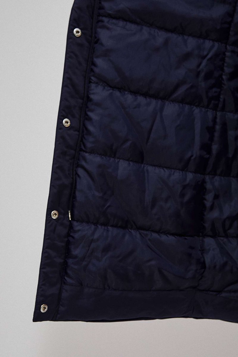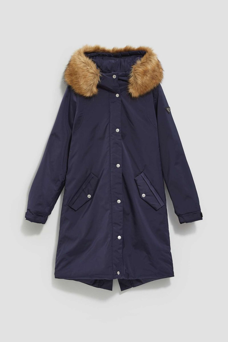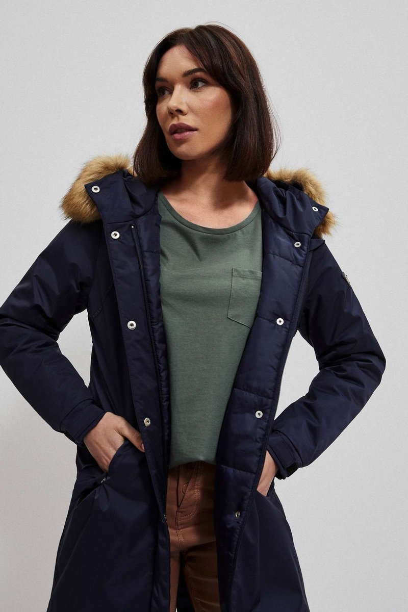 100%POLIESTER. Ciepła, pikowana kurtka w kolorze granatowym. Rękawy zakończone ściągaczem i regulowane paskiem, zapinanym na rzepy. Kaptur obszyty odpinanym futerkiem w kolorze beżowym. Na przodzie dwie, wpuszczane kieszenie. Całość zapinana na zamek, ukryty pod zaszewką oraz srebrne zatrzaski.