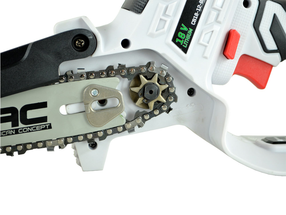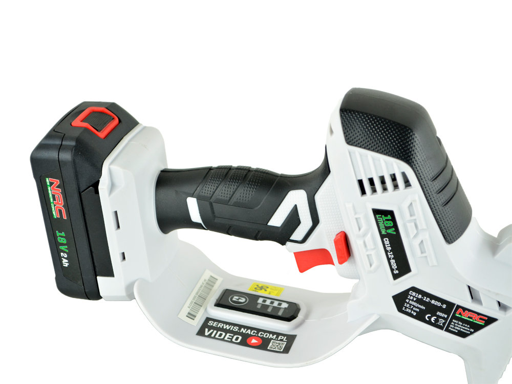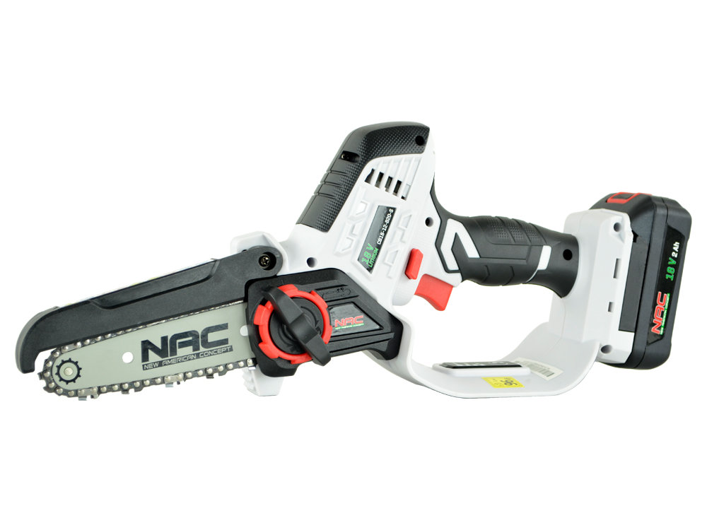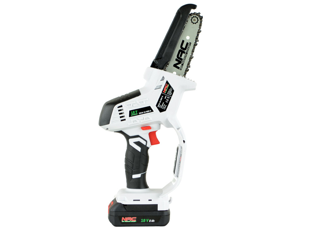 Akumulatorowa pilarka łańcuchowa do podcinania gałęzi z akumulatorem 18 V 2 Ah.Prowadnica i łańcuch o długości 13 cm oraz system szybkiego naciągu łańcucha tzw. "SDS"Model NAC CB18-12-B20-S