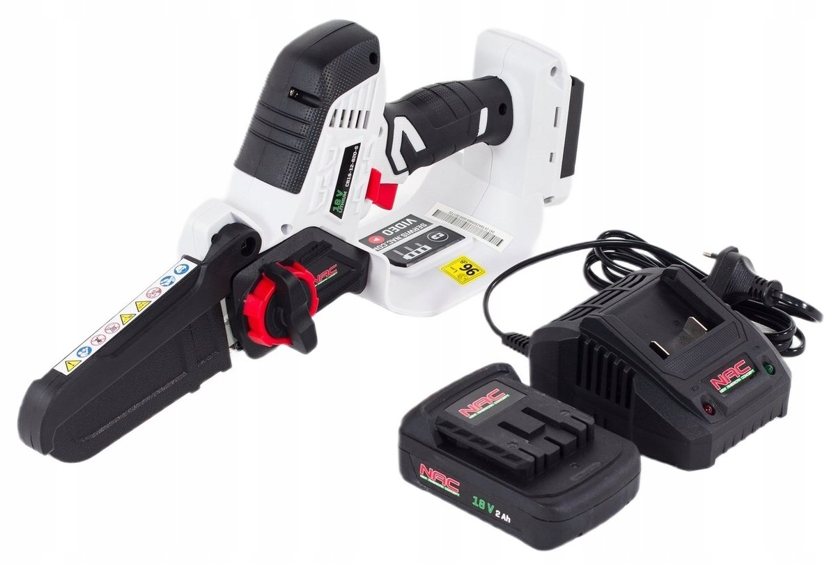 Lekka, akumulatorowa pilarka do podcinania gałęzi drzew i krzewów zasilana akumulatorem litowo-jonowy o napięciu 18 V i pojemności 2 Ah. W zestawie prowadnicę i łańcuch firmy NAC o długości 12,7 cm.