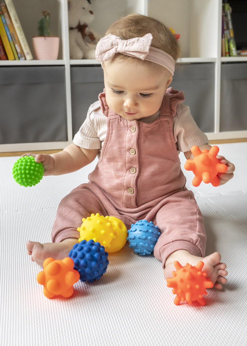 Zestaw ośmiu piłeczek sensorycznych przeznaczonych do masażu ciała, rehabilitacji, ćwiczeń gimnastycznych czy nawet kąpieli. Dzięki różnorodności piłeczek pod kątem fraktury, kolorystyki i ciężaru, angażują najważniejsze zmysły dziecka by wzmacniać doświadczenia i pozwalać mu na różne działania.