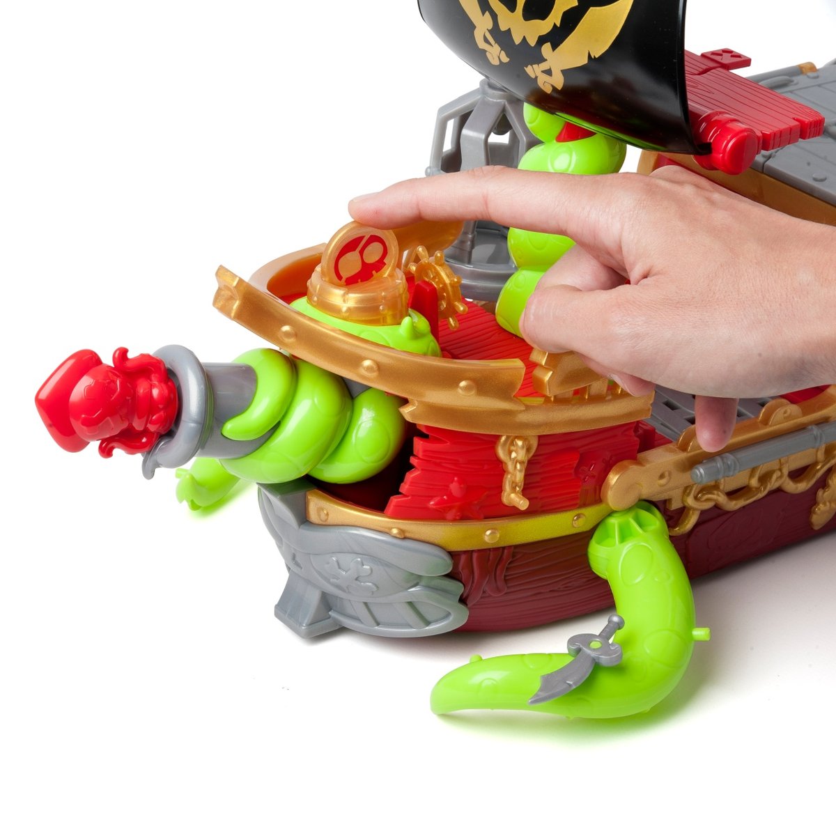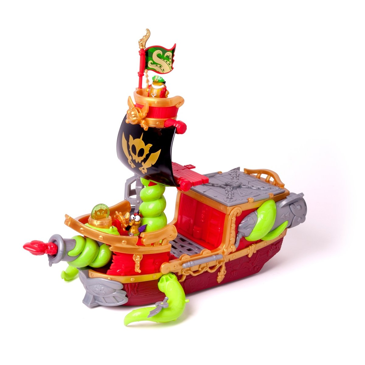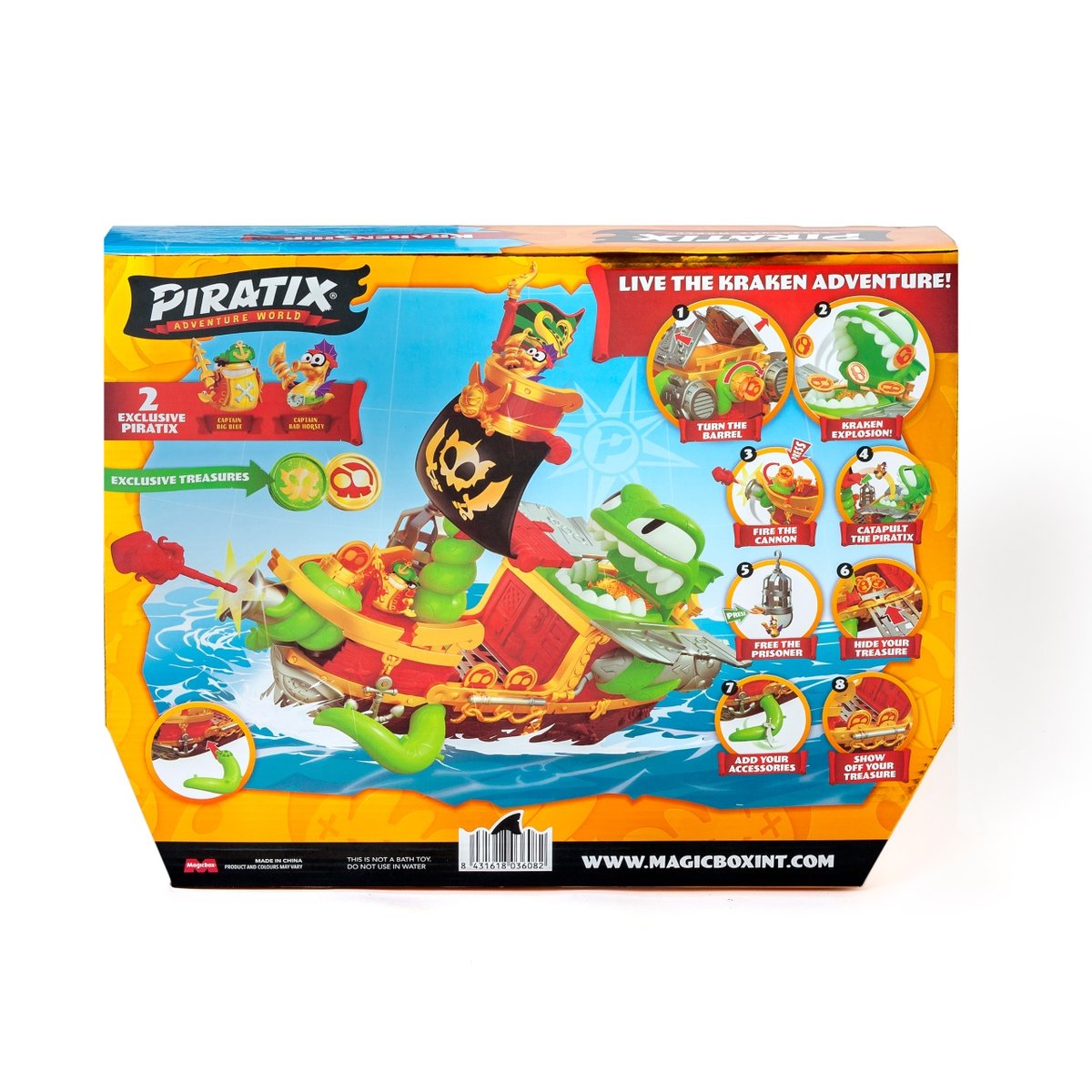 Na statku Krakena możesz przeżywać tysiące przygód! Użyj skarbu, aby celować i strzelać z działa, otwórz więzienie, aby uwolnić uwięzionych Piratixów i „obudź” Krakena, który pojawi się na rufie statku, wyrzucając cały skarb ze swojej paszczy w powietrze. To właśnie w jego szczękach znajdziesz ekskluzywny skarb Krakena, którego tak wielu szukało bez powodzenia, a teraz jest twój! Użyj katapulty, aby wrzucać swoich rywali Piratix prosto do jego szczęk – teraz Kraken i jego straszliwa załoga, Kapitan Wielki Niebieski i jego zaufany pomocnik Zły Koń, są twoimi sojusznikami! Zabierz swoją kolekcję Piratix na pokład i włóż monety do różnych uchwytów rozmieszczonych na całym statku, w tym na górze bocianiego gniazda.