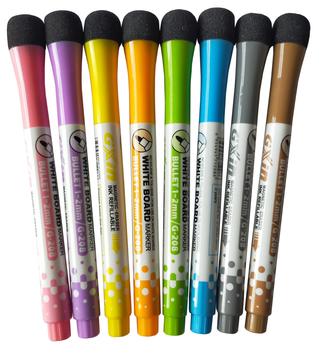 Komplet zawiera 8 sztuk zapakowanych w woreczek foliowy pisaków w kolorach: żółty, pomarańczowy, brązowy, różowy, zielony, fioletowy, niebieski, szary.