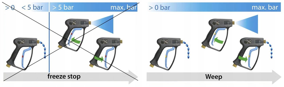 Gdy wąż nie jest pod ciśnieniem, część wody jest odprowadzana, co zapobiega zamarzaniu; natomiast podczas pracy, gdy wąż jest pod ciśnieniem, zachowuje się jak normalny pistolet natryskowy.