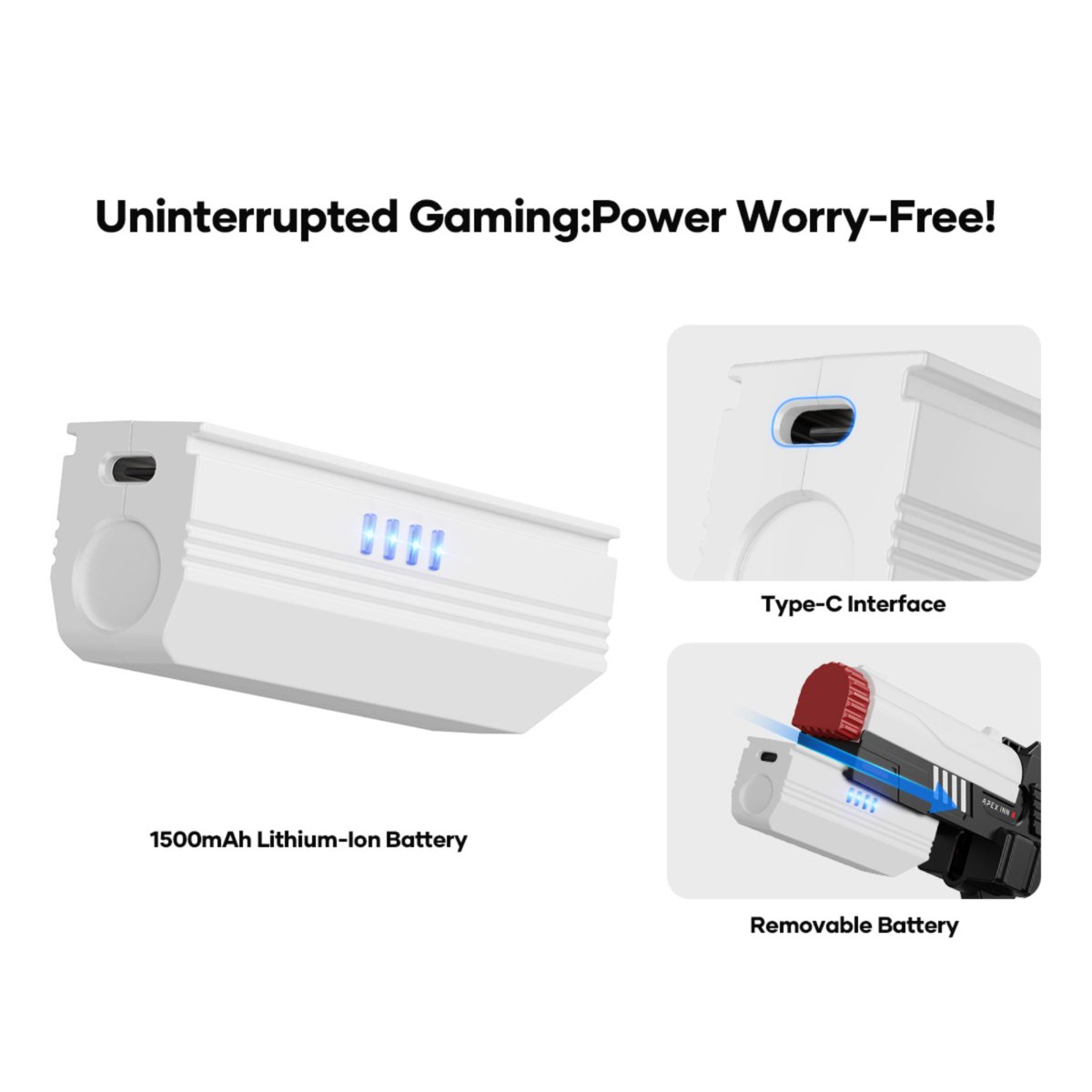 Wyposażony w akumulator o pojemności 1500 mAh, zapewnia do 3 godzin ciągłej gry. Czterosegmentowy niebieski wyświetlacz LED pozwala na bieżąco monitorować poziom naładowania i postęp ładowania. Pełne naładowanie trwa tylko 3 godziny, a do zestawu dołączone są dwa kable danych, umożliwiające ładowanie obu uchwytów jednocześnie.