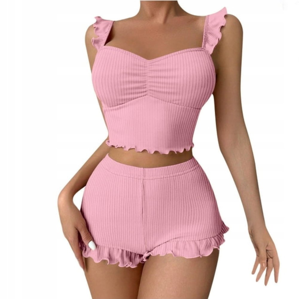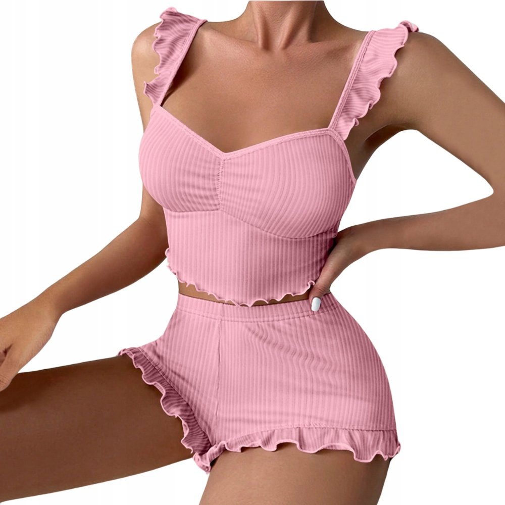 DWUCZĘŚCIOWA PRĄŻKOWANA PIŻAMA Z FALBANKAMI RÓŻÓWA Zmysłowa dwuczęściowa piżamka wykonana z miękkiego i wygodnego materiału to elegancki i klasyczny komplet bielizny ...