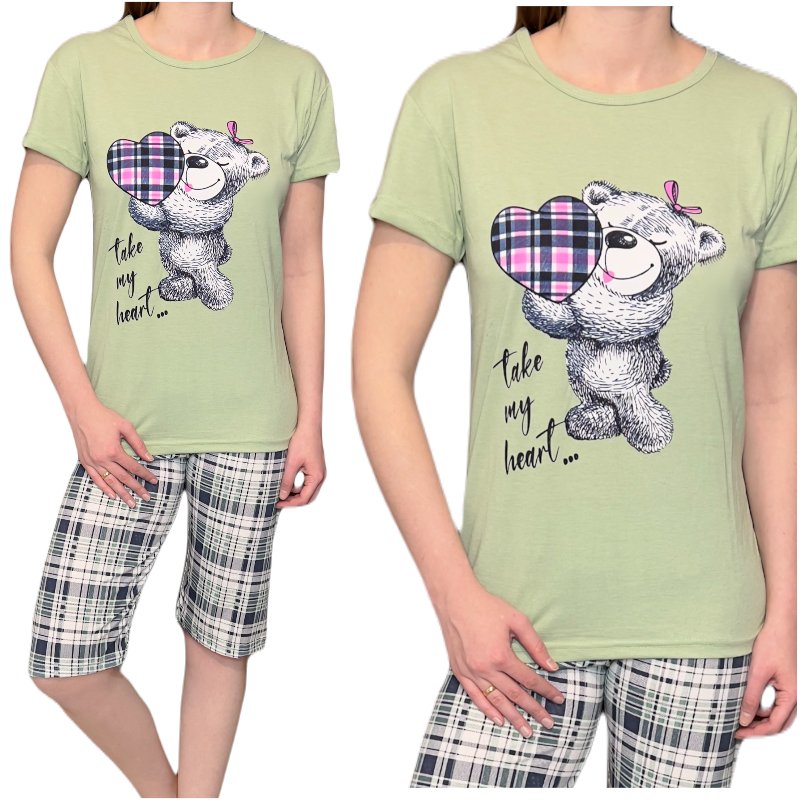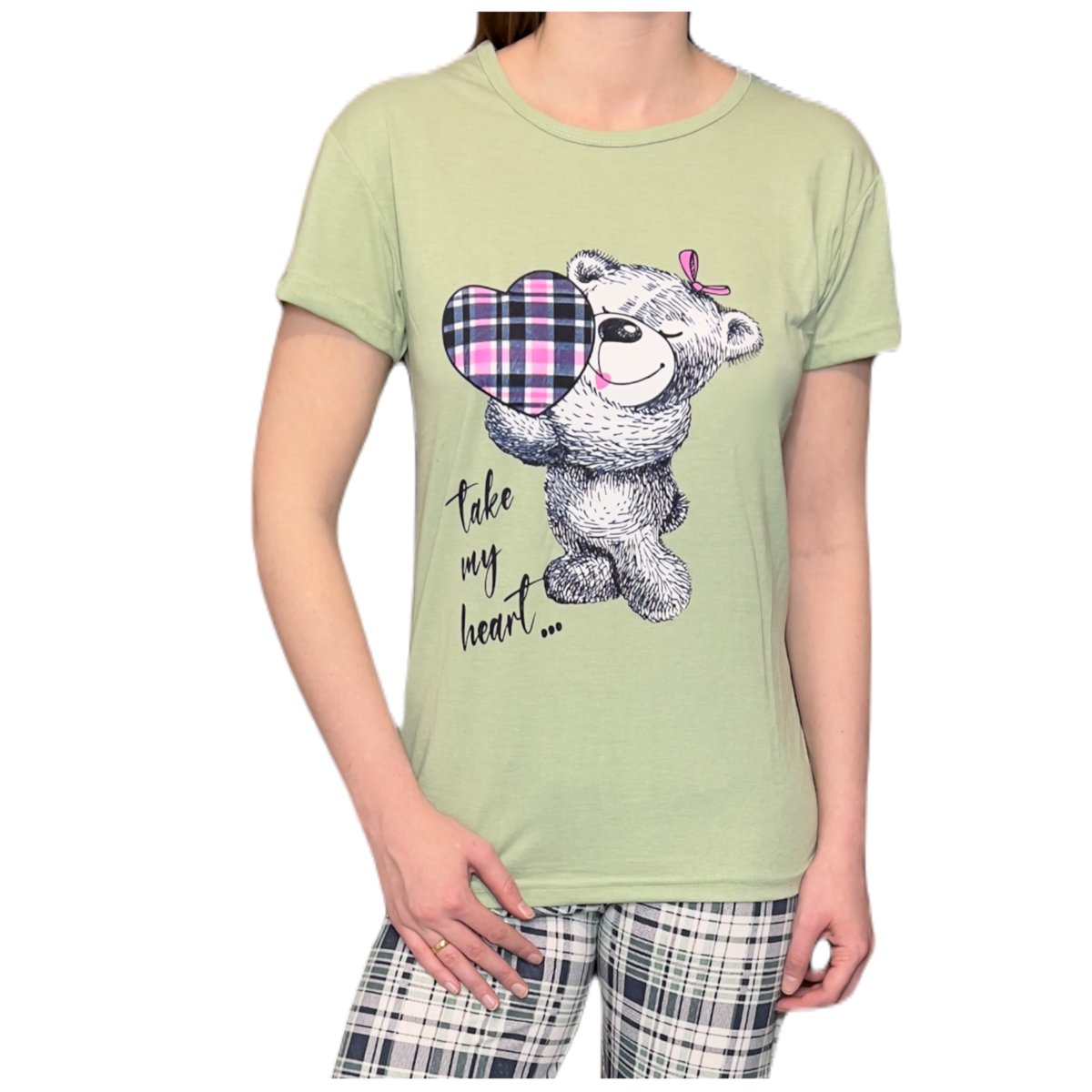 Właśnie zrecenzowałem Piżama damska oliwkowa z krótkim rękawem spodnie 3/4 kratka miś L