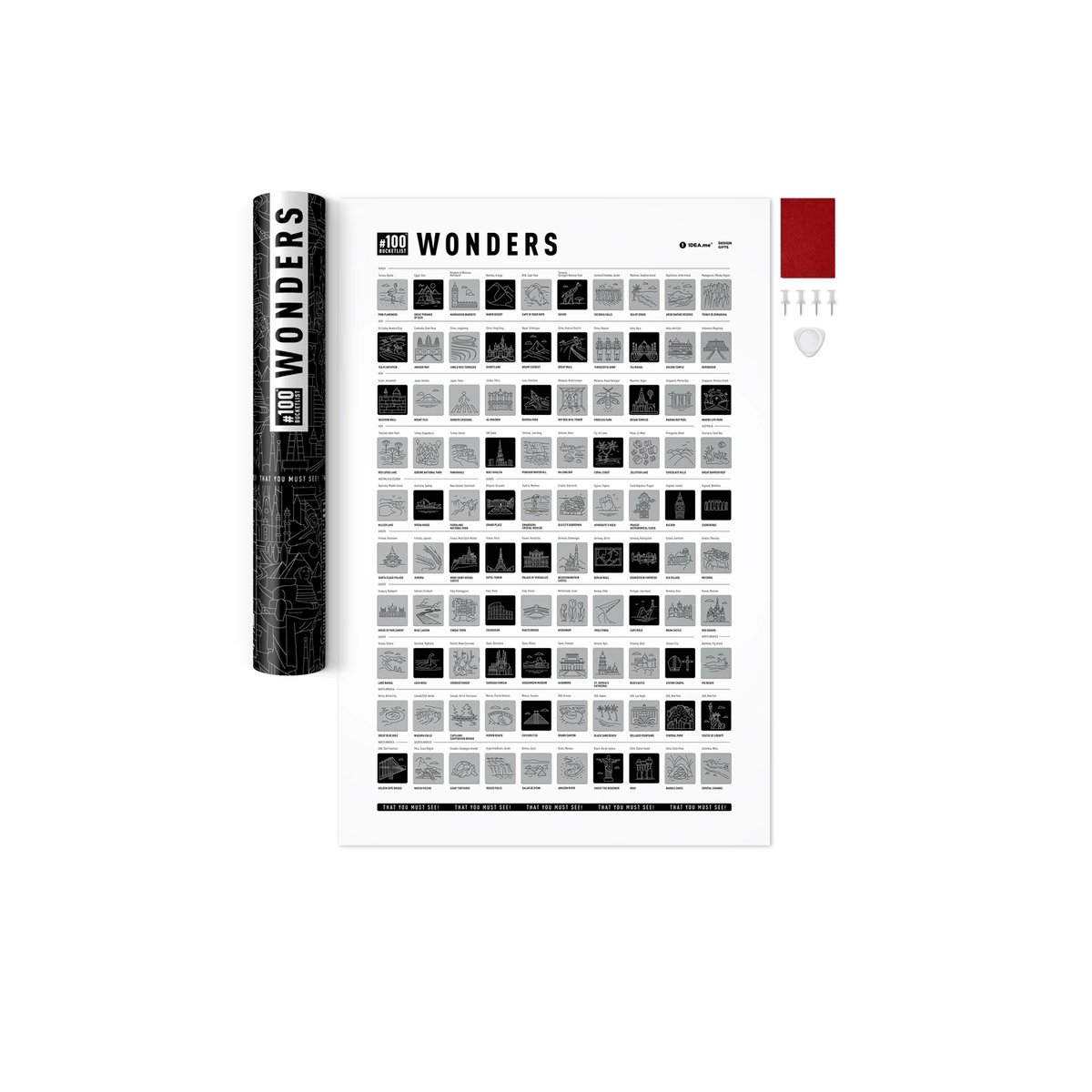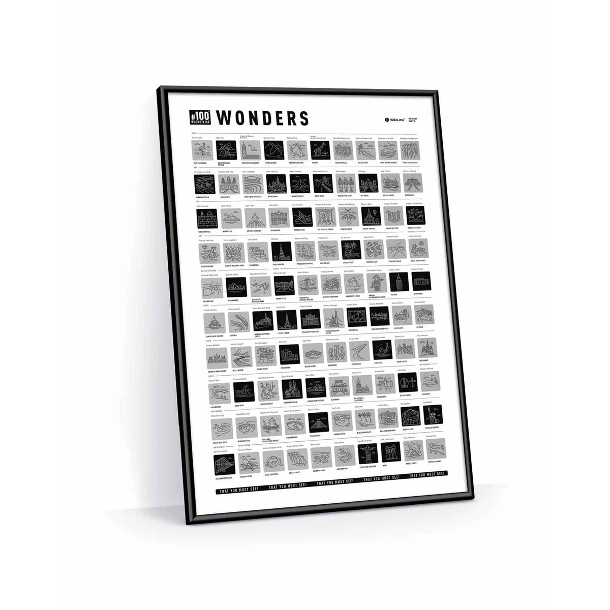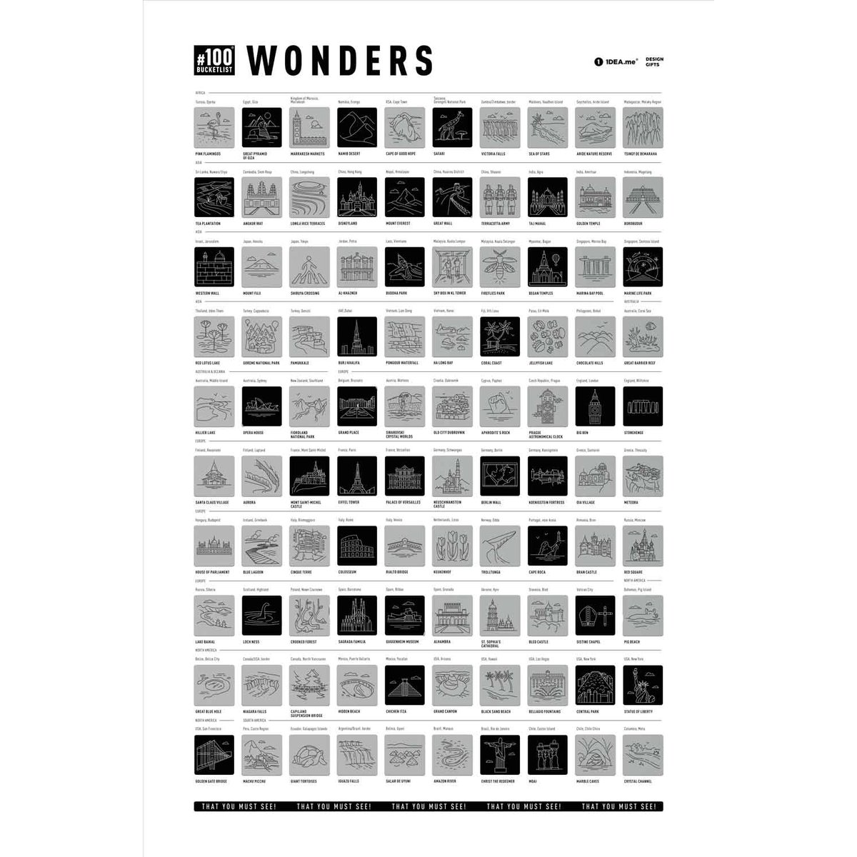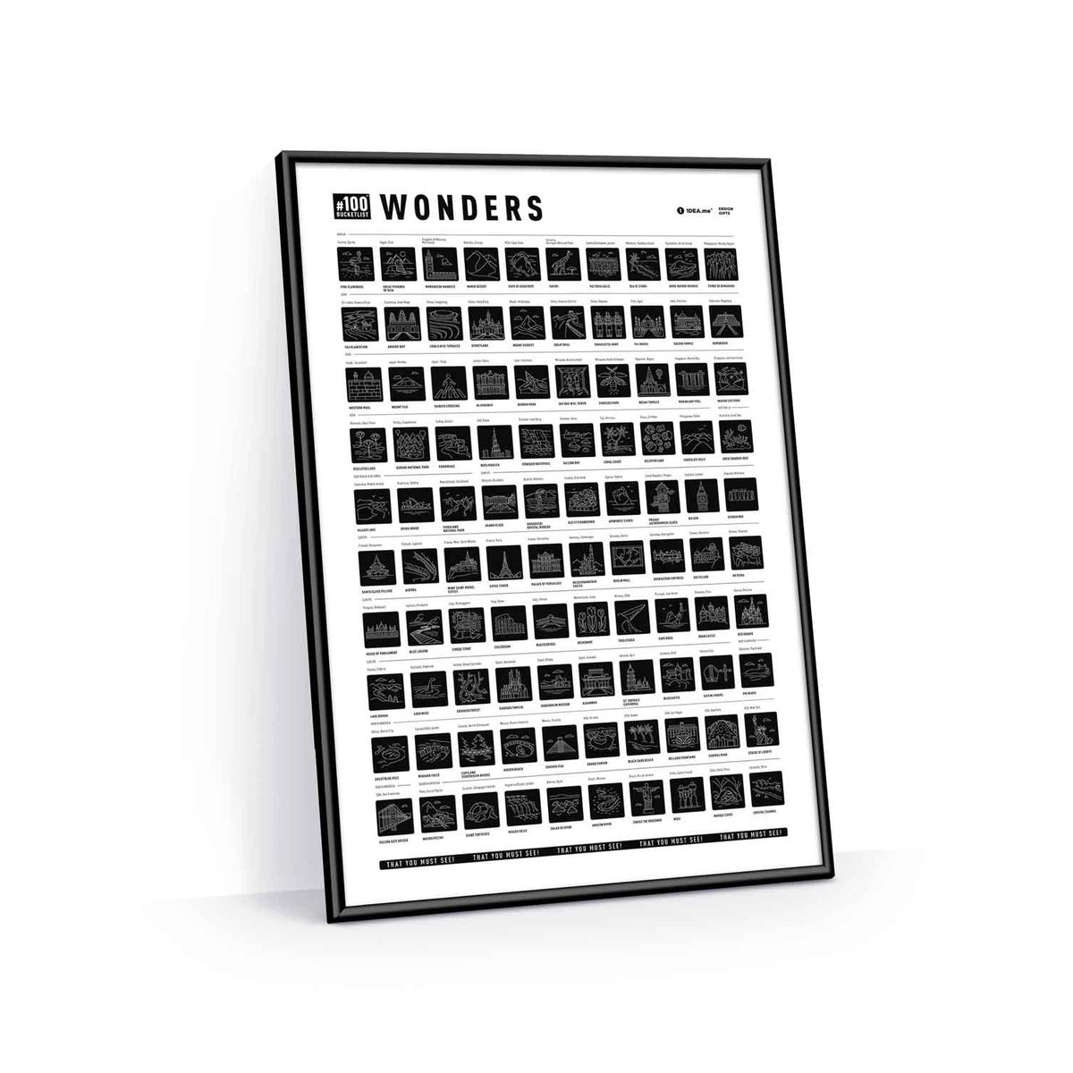 Bucketlist #100 Wonders Edition to wspaniale zaprojektowany interaktywny plakat ze 100 najbardziej imponującymi miejscami na ziemi. Wszyscy zapewne słyszeli o 7 Cudach Świata ale takich perełek jest