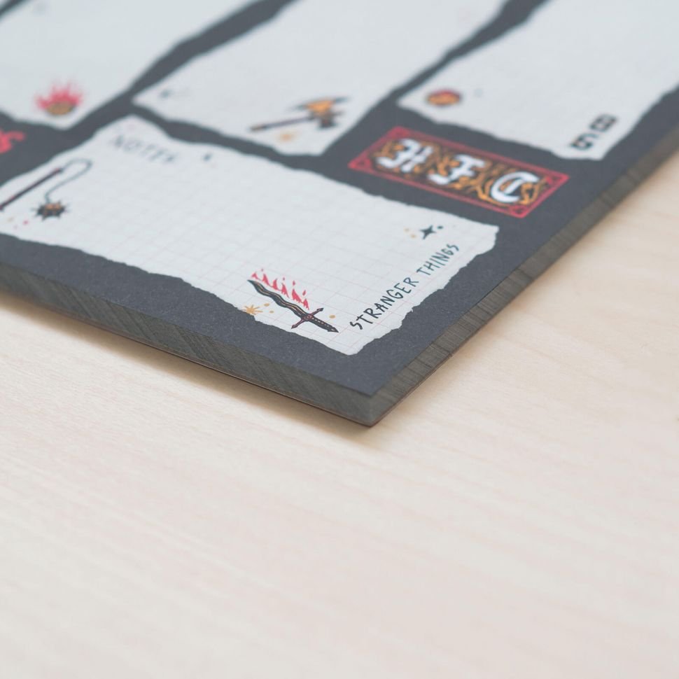 Przedstawiamy wyjątkowy planer dla fanów "Stranger Things", wzorowany na kultowym Hellfire Club. Ten produkt oddaje atmosferę gry Dungeons and Dragons oraz przygód mieszkańców Hawkins. Planery są idealnym dodatkiem dla osób, które uwielbiają uporządkowany styl życia. Ten konkretny design łączy w sobie namiętność fanów serialu z praktycznością codziennego planowania. To doskonały prezent dla każdego miłośnika "Stranger Things".