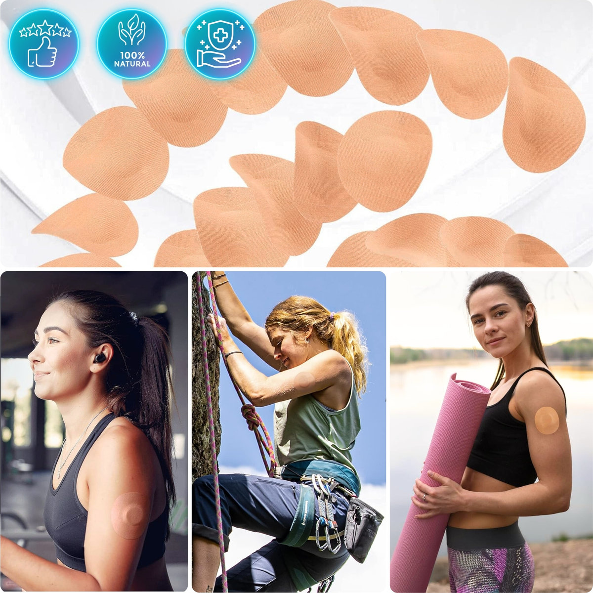 Plastry ochronne to niewielkie przylepce o średnicy ok. 7.5 cm, wykonane na bazie taśmy kinezjologicznej REVITY RECOVERY TAPE. Służą ochronie sensora podczas codziennych aktywności, gdy nie chcesz, aby Twój sensor był widoczny oraz podczas uprawiania sportów, celem zabezpieczenia.