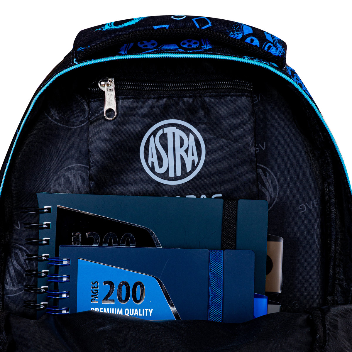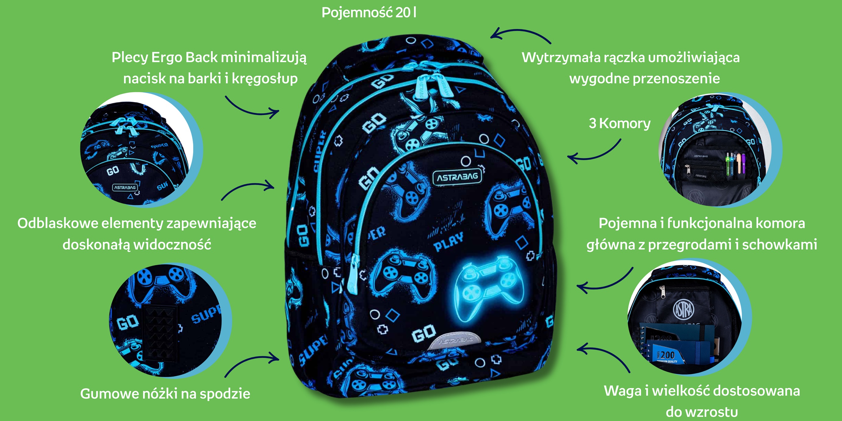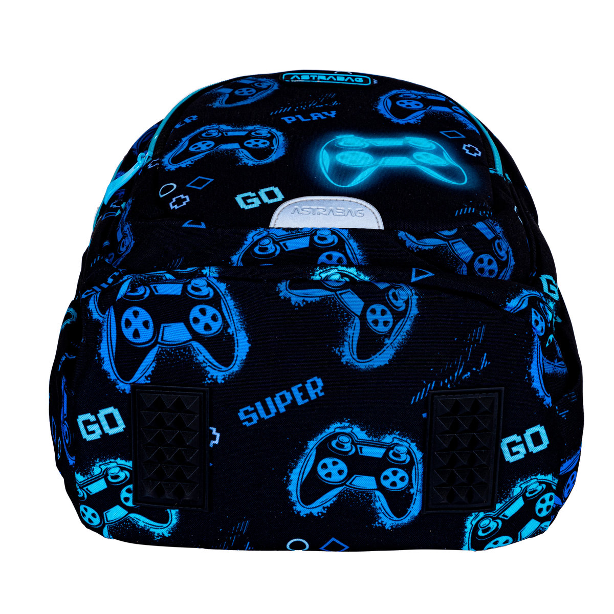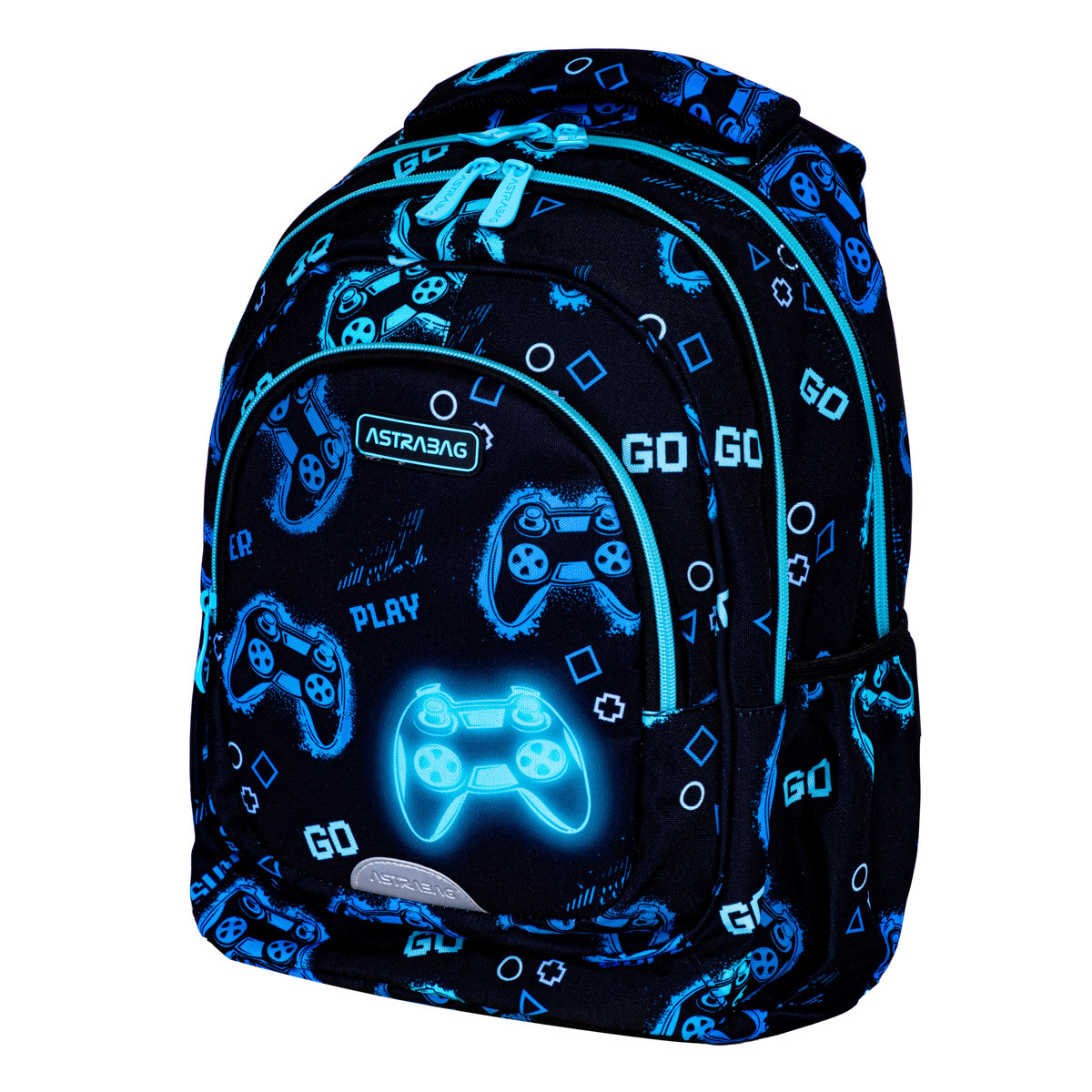 Plecak ASTRABAG Go Playing to plecak z neonowym motywem gamepadów i graficznych symboli, który zachwyca młodych graczy! Intensywny print w odcieniach niebieskiego z fluorescencyjnymi akcentami przenosi prosto do świata gier.