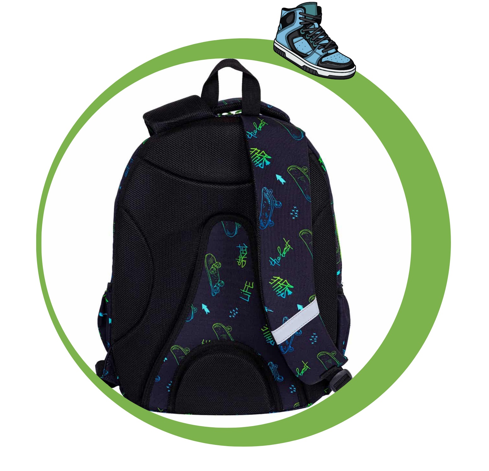 Regulowane, miękkie szelki dopasowują się do wzrostu dziecka, zapewniając wygodę podczas codziennego noszenia. Oddychający panel tylny zapobiega przegrzewaniu, co jest szczególnie ważne w cieplejsze dni. Ergonomiczna konstrukcja pomaga odciążyć plecy, dbając o zdrową postawę dziecka.