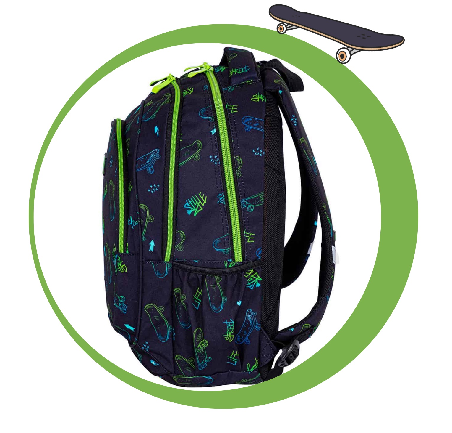Plecak posiada boczne kieszenie na bidon lub butelkę z wodą, co zachęca dziecko do regularnego nawadniania się. Dodatkowe przegródki pozwalają na uporządkowanie długopisów, kredek i innych drobiazgów. Wygodny uchwyt na górze ułatwia zawieszenie plecaka w szkole lub przenoszenie go w ręku.