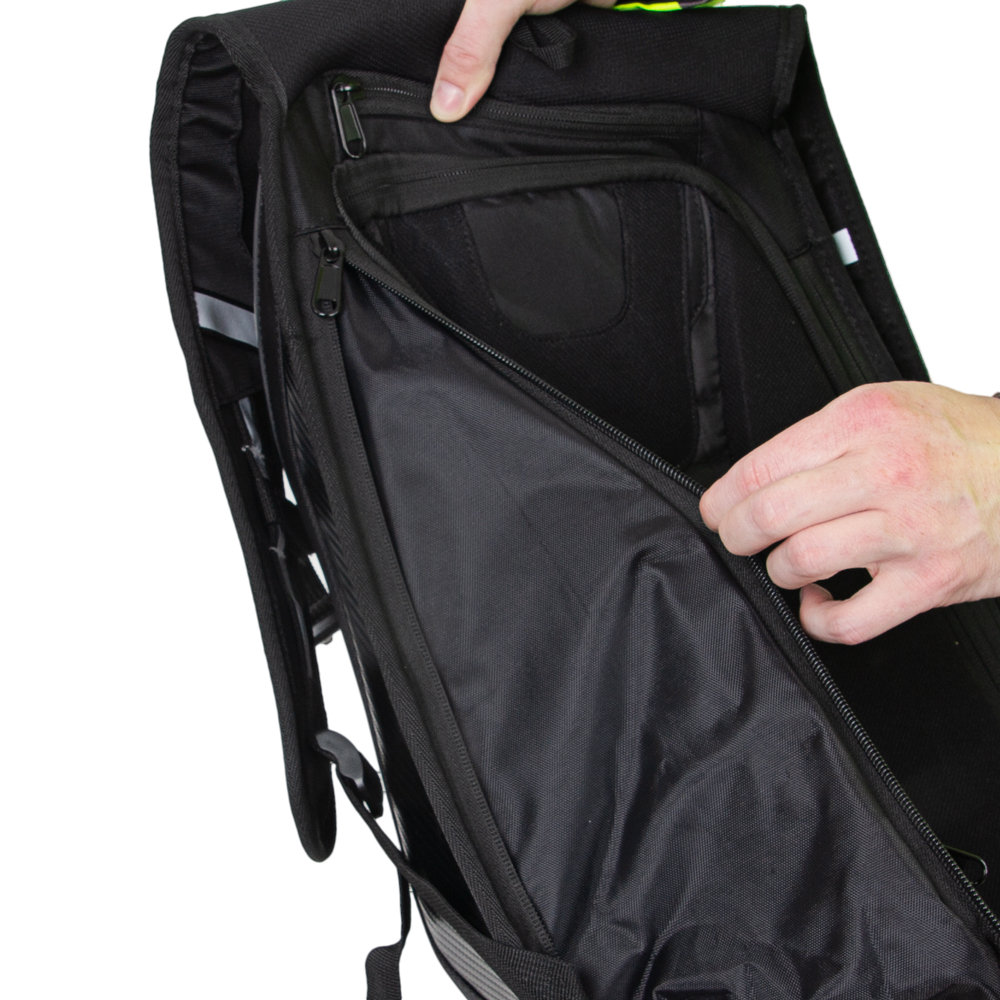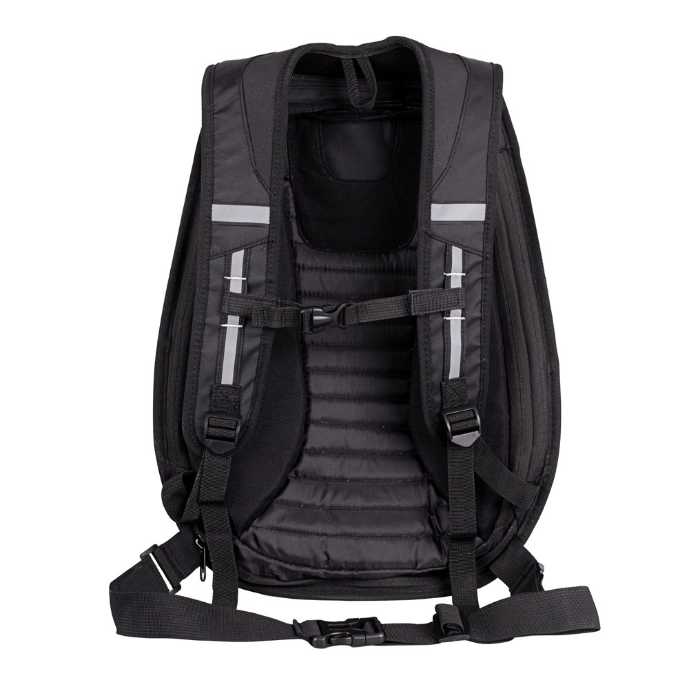 Paski naramienne o regulowanej długości mają odblaskowe elementy, które poprawiają widoczność motocyklisty w warunkach słabego oświetlenia. Ponadto plecak posiada również pasek na klatkę piersiową i pas biodrowy (oba można odpiąć), które pomagają zabezpieczyć go na miejscu. Jest też oczywiście górny uchwyt. Aby jeszcze bardziej zwiększyć bezpieczeństwo, na powłoce znajdują się również paski odblaskowe.
