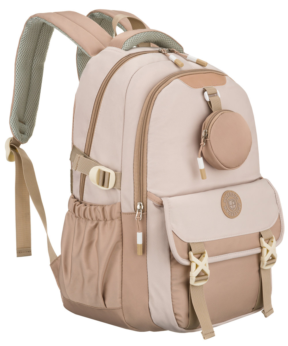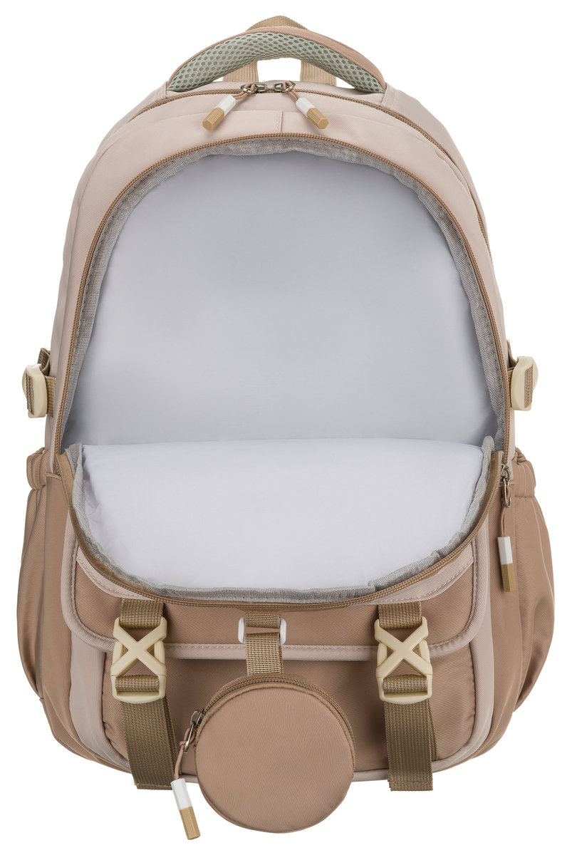 ✏️ Do przodu plecaka przymocowano okrągłą saszetkę o średnicy 9 cm, zapinaną na zamek.