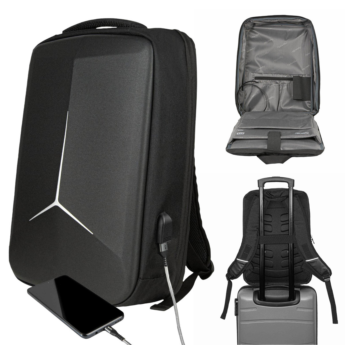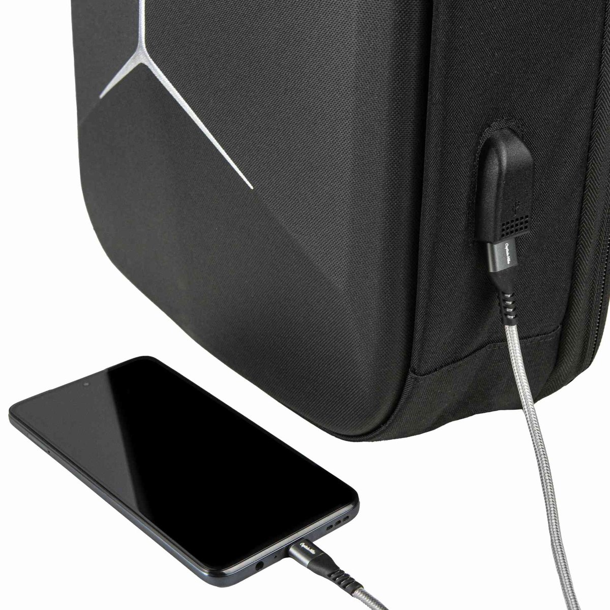 Plecak posiada wbudowane zewnętrzne gniazdo USB oraz długi przewód do wnętrza plecaka. Możesz do niego podłączyć swój powerbank (nie dołączony do zestawu).Możesz podłączyć telefon do ładowania podpinając go bezpośrednio do plecaka. Jest no niezwykle wygodne szczególnie w podróży!