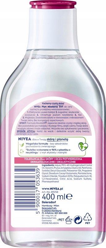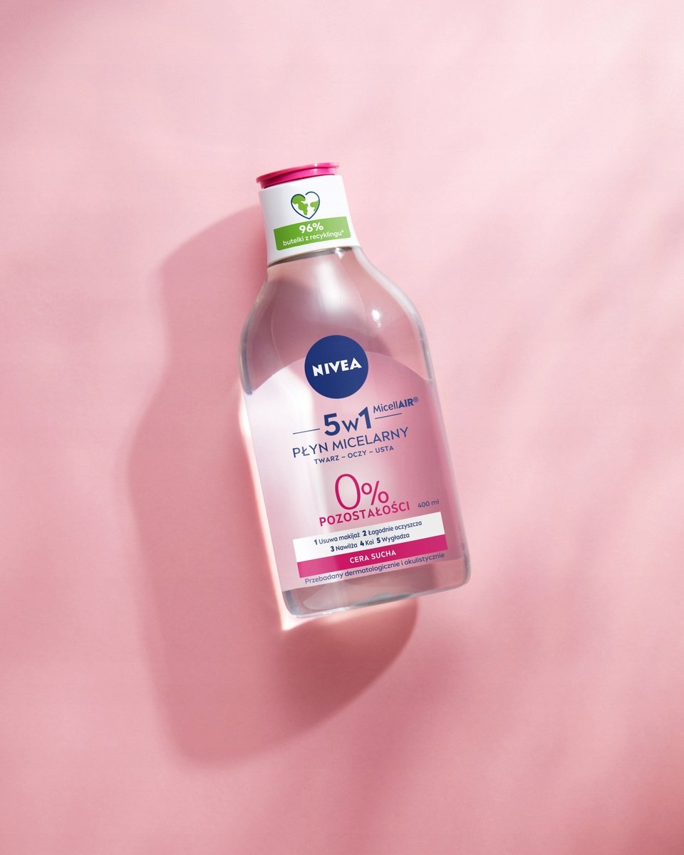 Kochamy czystą skórę! Właśnie dlatego powstał płyn micelarny NIVEA MicellAIR 5w1 - wielozadaniowa formuła z naturalnym olejkiem migdałowym efektywnie usuwa makijaż oraz łagodnie oczyszcza suchą cerę, bez przesuszania jej. Woda micelarna świetnie sprawdzi się do demakijażu twarzy, oczu oraz ust. Wyjątkowo łagodna formuła bez kompozycji zapachowej dokładnie oczyszcza cerę, a jednocześnie koi ją i pomaga utrzymać odpowiedni poziom jej nawilżenia, zapobiegając przesuszaniu. Skuteczność płynu micelarnego NIVEA jest widoczna gołym okiem - nie wymaga pocierania, aby w pełni usunąć makijaż - bez pozostałości i tłustego filmu na skórze, dzięki czemu Twoja skóra wygląda zdrowo i może oddychać. Wegańska formuła płynu micelarnego NIVEA MicellAIR (bez składników pochodzenia zwierzęcego) działa w zgodzie z mikrobiomem Twojej skóry. Tolerancja dla skóry i oczu potwierdzona dermatologicznie i okulistycznie.
