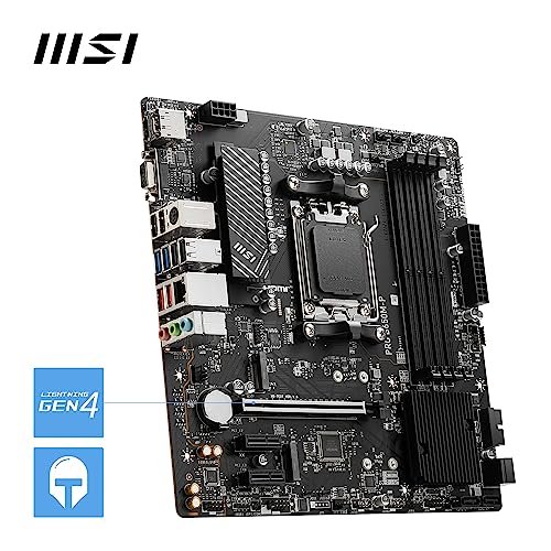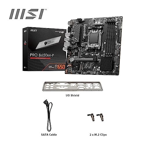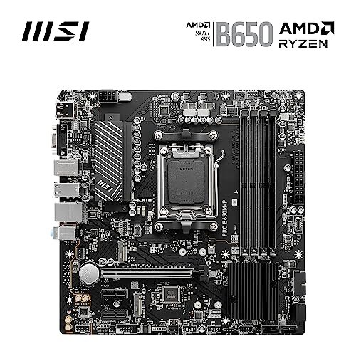 Płyta główna MSI PRO B650M-P, Micro-ATX – obsługuje procesory AMD Ryzen z serii 7000, AM5 – DDR5 Memory Boost 6000+MHz/OC, 1 x PCIe 4.0 x16, 2 x M.2 Gen4, 2.5G LAN PRO B650M-P Ryzen 7000 GOTOWY — PRO B650M-P to kompaktowa płyta główna Micro-ATX wyposażona w chipset AMD B650 (obsługuje AM5 i Ryzen 7000); VRM wykorzystuje technologię MSI Core Boost zapewniającą lepszą stabilność i wydajność CHŁODZENIE PASYWNE I AI - Chłodzenie pasywne obejmuje 6-warstwową płytkę drukowaną o pojemności 2 uncji. pogrubiony radiator miedziany i chipsetu; Chłodzenie Frozr AI automatycznie dostosowuje ustawienia wentylatora systemowego w oparciu o temperaturę procesora i karty graficznej PAMIĘĆ DDR5, DWA GNIAZDA PCI-E 4.0 x16 - 4 gniazda DDR5 DIMM SMT umożliwiają szybką pamięć i poprawiają klarowność sygnału (1DPC 1R, 6000+ MHz); 1 x gniazdo PCIe 4.0 x16 (64 GB/s) obsługuje karty graficzne ZŁĄCZE GEN4 M.2 - Opcje przechowywania obejmują 2 gniazda M.2 Gen4 x4 64 Gb/s zapewniające niezwykle szybki dostęp do dysku SSD DOBRE POŁĄCZENIE - Sprzęt sieciowy obejmuje sieć LAN 2,5 Gb/s; Tylne porty obejmują USB 3.2 Gen 2 Type-A (10 Gb/s), HDMI 2.1, DisplayPort 1.4, VGA i 7.1 HD Audio z funkcją Audio Boost
