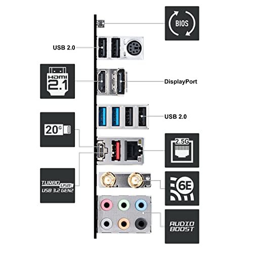WI-FI 6E CONNECTED — wyposażony w najnowszy moduł Wi-Fi 6E (ultra małe opóźnienia , duża przepustowość) i technologia Bluetooth 5.2; Stałe porty obejmują USB 3.2 Gen 2x2 Type-C (20 Gb/s), wyświetlacz 4K/60 Hz HDMI 2.1, Intel 2.5G LAN i dźwięk 7.1 HD z funkcją Audio Boost