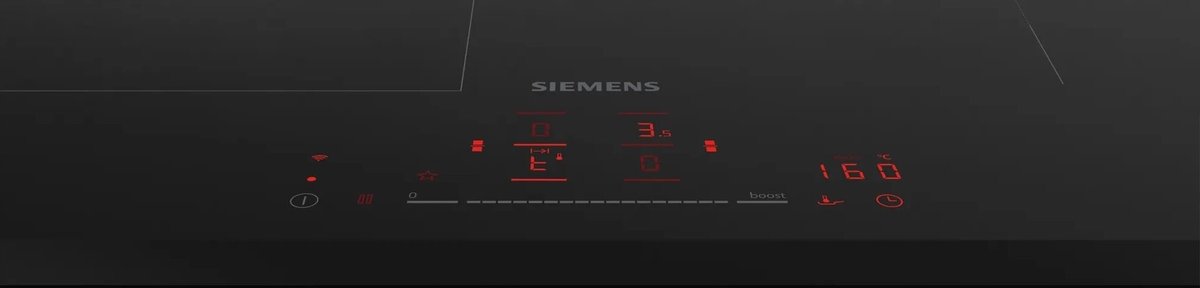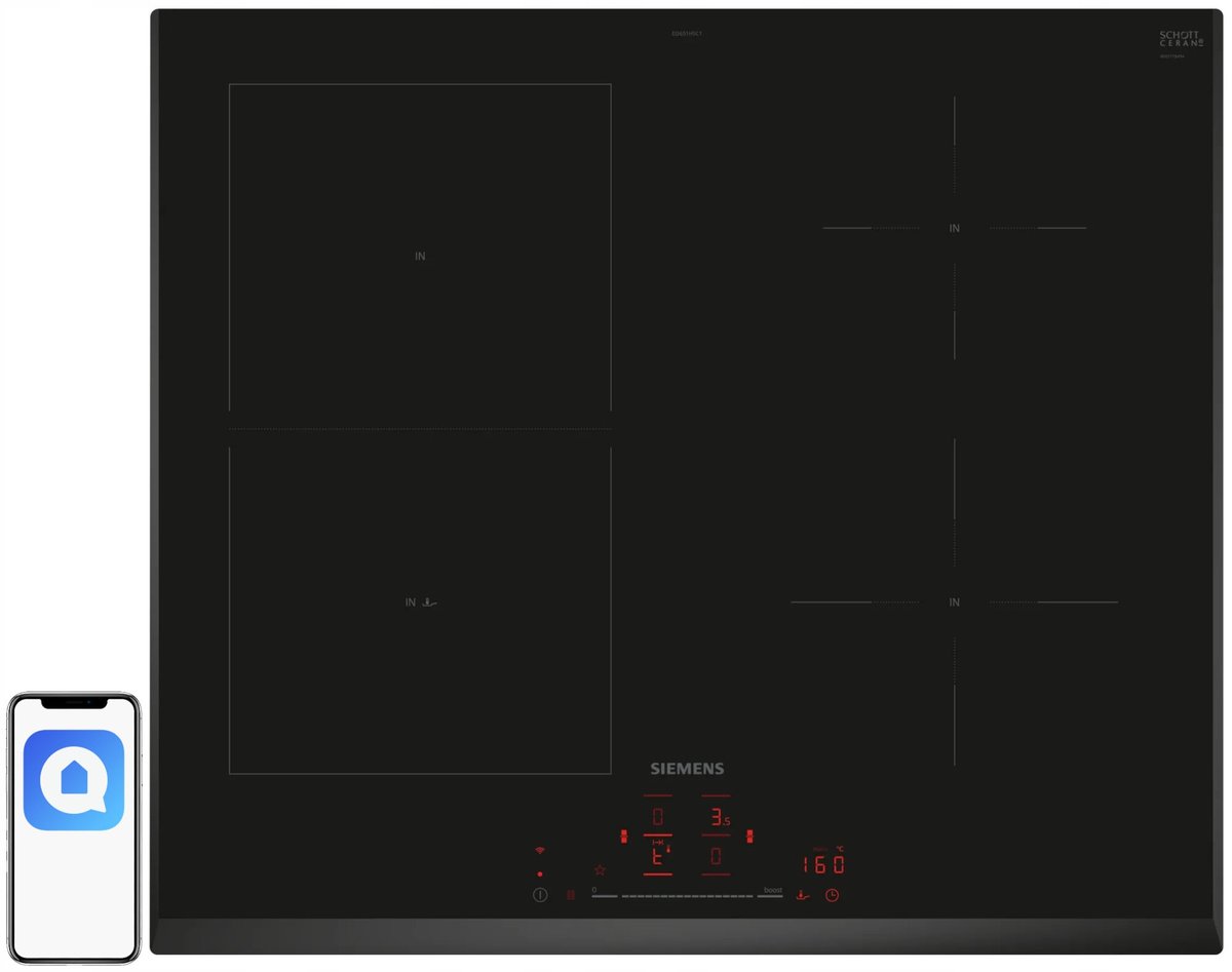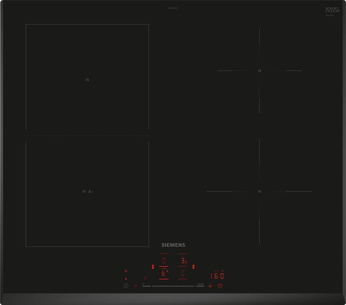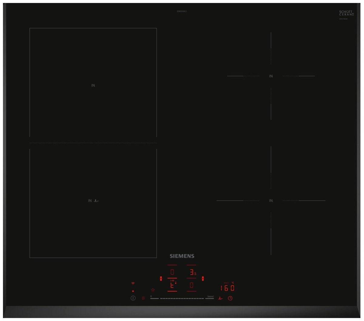 Płyta indukcyjna SIEMENS ED651HSC1E o szerokości 59.2 cm, posiada 4 pola grzejne o mocy całkowitej 6900 W. Płyta wyposażona została w 17 poziomów mocy, timer oraz funkcję PowerBoost, PowerManagement, QuickStart i ReStart.