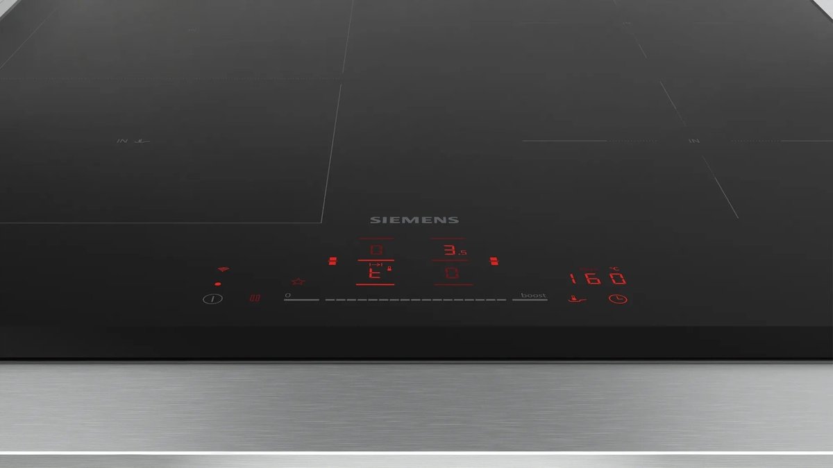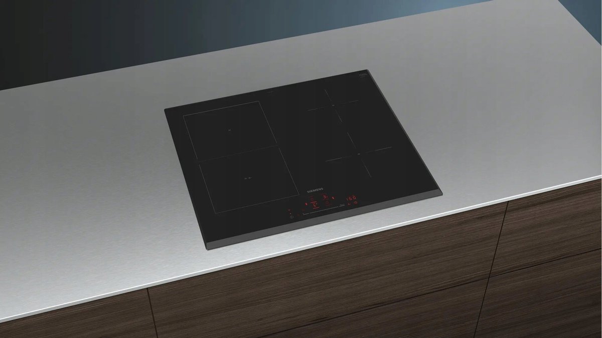 Płyta indukcyjna SIEMENS ED651HSC1E o szerokości 59.2 cm, posiada 4 pola grzejne o mocy całkowitej 6900 W. Płyta wyposażona została w 17 poziomów mocy, timer oraz funkcję PowerBoost, PowerManagement,