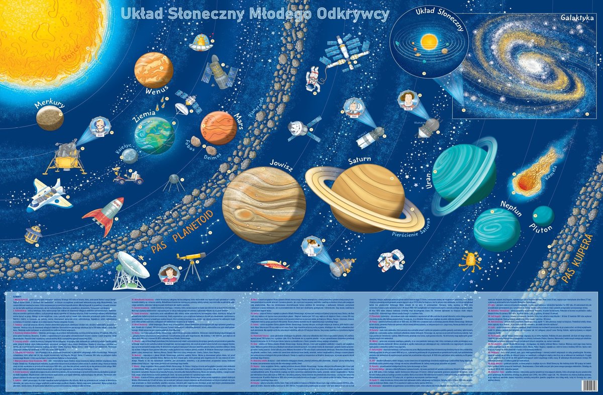 Wiadomości dotyczące poszczególnych elementów w łatwy sposób można odnaleźć dzięki numerycznej legendzie znajdującej się na dole mapy, będą to nie tylko opisy poszczególnych planet, lecz także ciekawostki dotyczące historii odkrywania kosmosu. Mapa w harmonijny sposób łączy w sobie aspekty merytoryczne, jak i wizualne, dzięki czemu świetnie sprawdzi się w roli elementu dekoracyjnego w dziecięcym pokoju. Układ Słoneczny Młodego Odkrywcy to mapa, dzięki której w ciekawy sposób możesz pomóc swojemu dziecku w rozwijaniu jego pasji oraz zainteresowań.