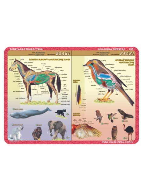 Podkładka edukacyjna - anatomia zwierząt 053 dwustronna podkładka edukacyjna na biurko do nauki biologii wymiary: 40x30 cm znajduje się na niej omówienie anatomii: ssaków, ptaków, płazów i g ...