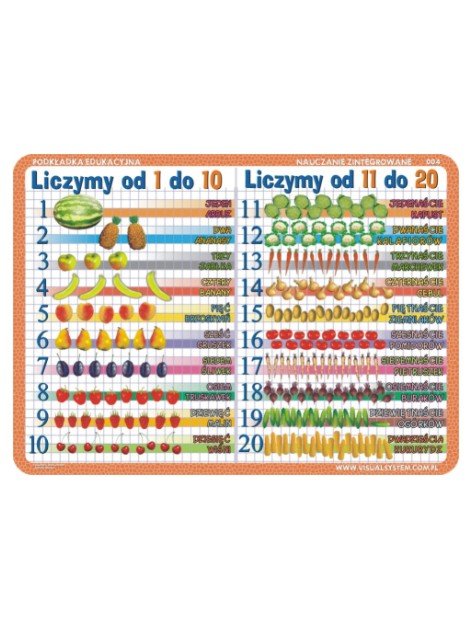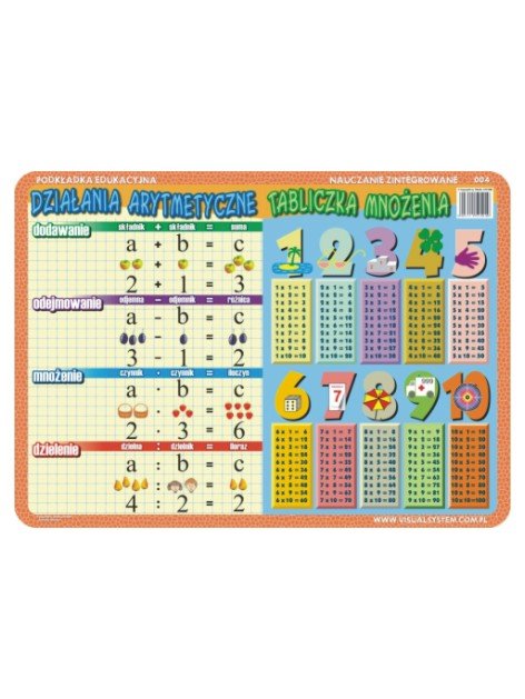 Podkładka edukacyjna - nauczanie zintegrowane 004 dwustronna podkładka edukacyjna na biurko dla najmłodszych do nauki podstaw matematyki wymiary: 40x30 cm znajdują się na niej tematy: liczymy od