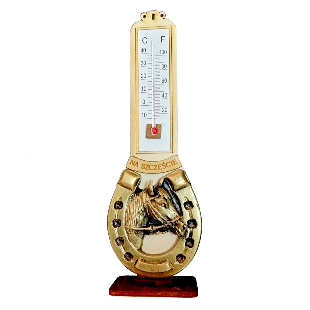 Podkowa z termometrem na podstawce. Ozdobny termometr, który łączy praktyczność z eleganckim designem. Produkt wykonany z dbałością o detale, składa się z drewnianej podstawy oraz podkowy w złotym kolorze, ozdobionej wizerunkiem końskiej głowy. Podkowa, będąca symbolem szczęścia, opatrzona jest napisem „Na szczęście”, co nadaje całości pozytywny i symboliczny charakter. Na górze konstrukcji znajduje się termometr mierzący temperaturę w dwóch skalach: Celsjusza (°C) i Fahrenheita (°F). Skala jest wyraźna i łatwa do odczytania, a wskaźnik temperatury wyróżnia się czerwonym kolorem. To wyjątkowe połączenie dekoracji i funkcjonalności sprawia, że termometr idealnie nadaje się na prezent lub jako stylowy element dekoracyjny do domu. Wprowadza do wnętrza zarówno praktyczność, jak i ciepły, szczęśliwy akcent.