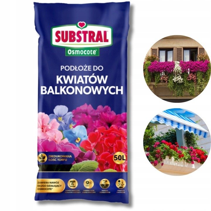 Substral Osmocote to gotowe podłoże do kwiatów balkonowych. Przeznaczone do przesadzania i sadzenia roślin balkonowych i tarasowych: pelargonia, surfinia, niecierpek, fuksja, begonia, aksamitka, werbena, datura i inne (innego podłoża wymagają rośliny kwaśnolubne typu iglaki, rododendrony).