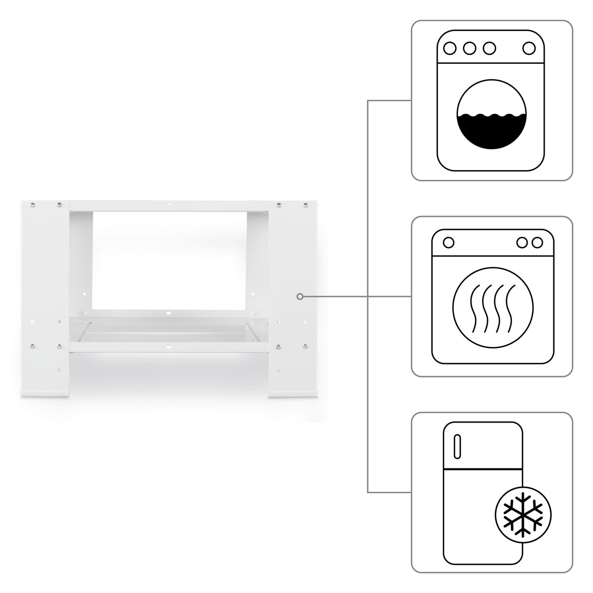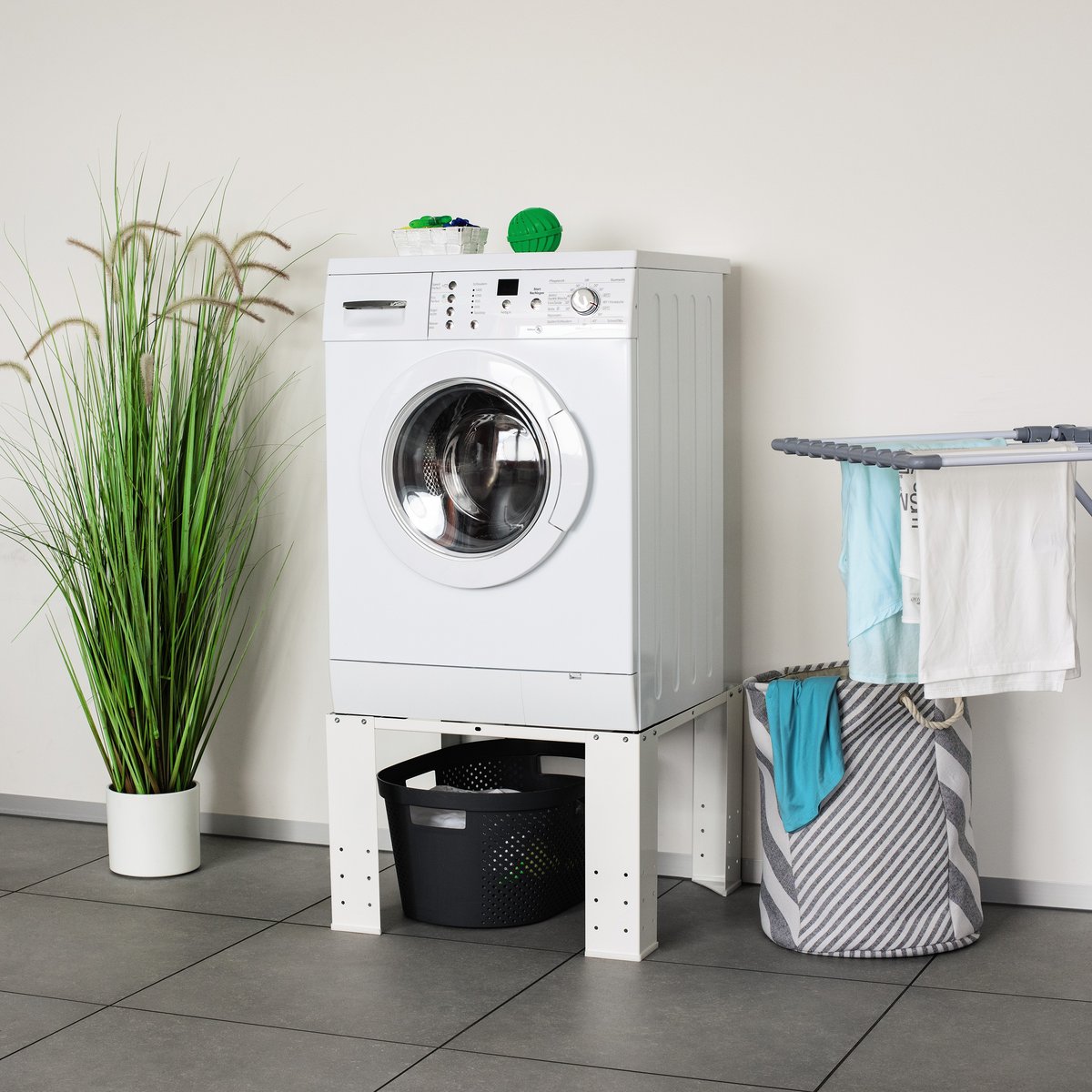 Podstawa do pralki/suszarki umożliwia ustawienie urządzenia na optymalnej wysokości, co ułatwia wkładanie i wyjmowanie prania. Dzięki temu codzienne obowiązki stają się wygodniejsze, a kręgosłup pozostaje odciążony.