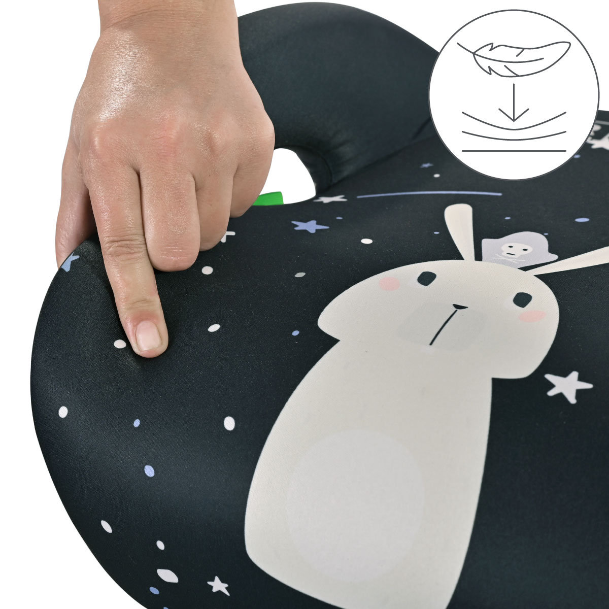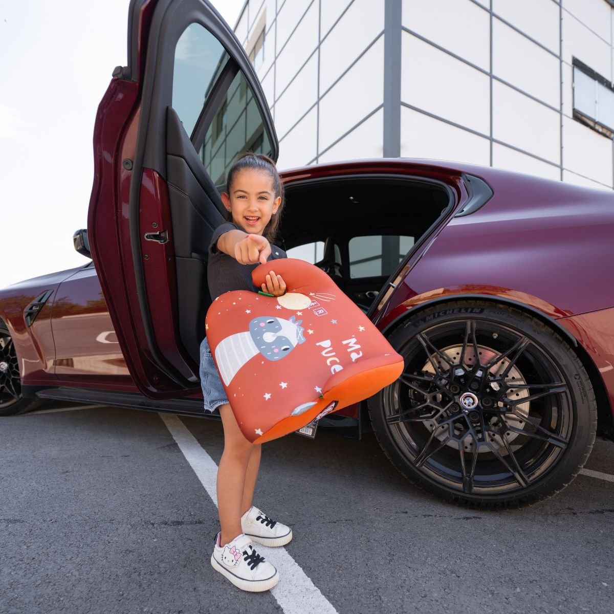 Proszę używać wyłącznie z pasem samochodowym – podkładka nie jest przeznaczona do montażu bez niego. Zawsze sprawdzaj stabilność montażu po każdej instalacji. Używaj podkładki TYLKO dla dzieci w odpowiednim wzroście; po przekroczeniu 150 cm, zakończ użytkowanie. Przed praniem sprawdź instrukcję – nie używaj agresywnych detergentów, wybielaczy ani suszenia w gorącej suszarce.