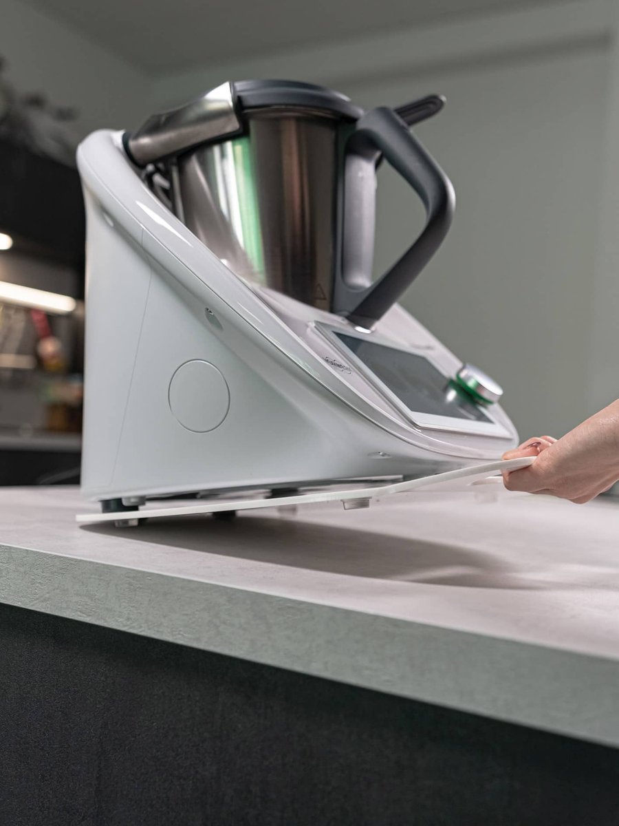 Nawet przeszkody, takie jak obramowanie płyty kuchennej, nie stanowią dla niego problemu. W mgnieniu oka pokonuje wszelkie nierówności na kuchennym blacie. Aby to zrobić, chwyć bok Thermomixa i możesz z łatwością przesuwać przesuwaną deskę razem z robotem kuchennym.