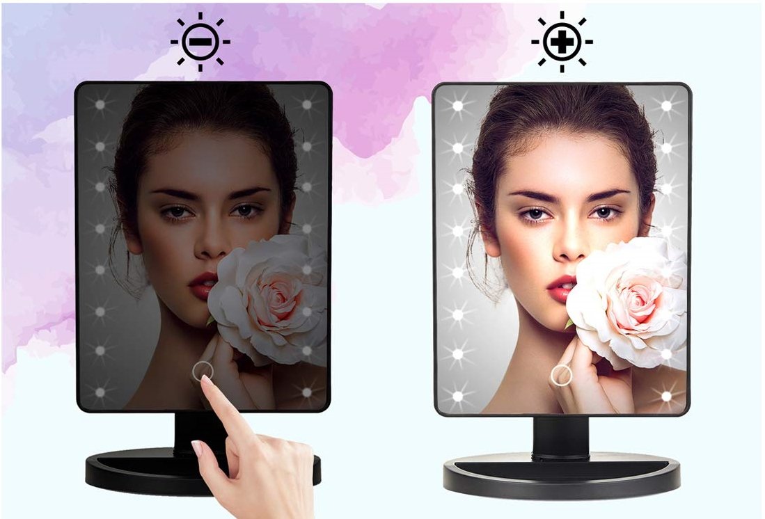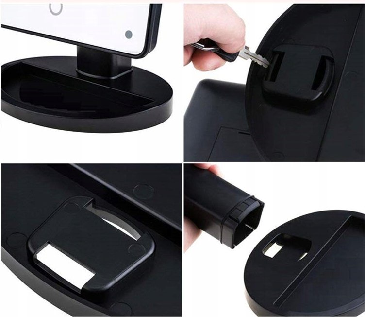Lusterko kosmetyczne posiada szeroką i stabilną podstawę, dzięki czemu nie ma ryzyka, że się przewróci, nawet przy maksymalnym kącie nachylenia tafli lustra. Podświetlane lusterko kosmetyczne uruchamiane jest za pomocą przełącznika ON/OFF, który znajduje się w tylnej części obudowy. Intensywność świecenia diod można natomiast regulować za pomocą przycisku, który umieszczony jest w dolnej części lusterka kosmetycznego – wystarczy przytrzymać przycisk chwilę dłużej i poziom oświetlenia zmieni się płynnie na bardziej lub mniej intensywny.