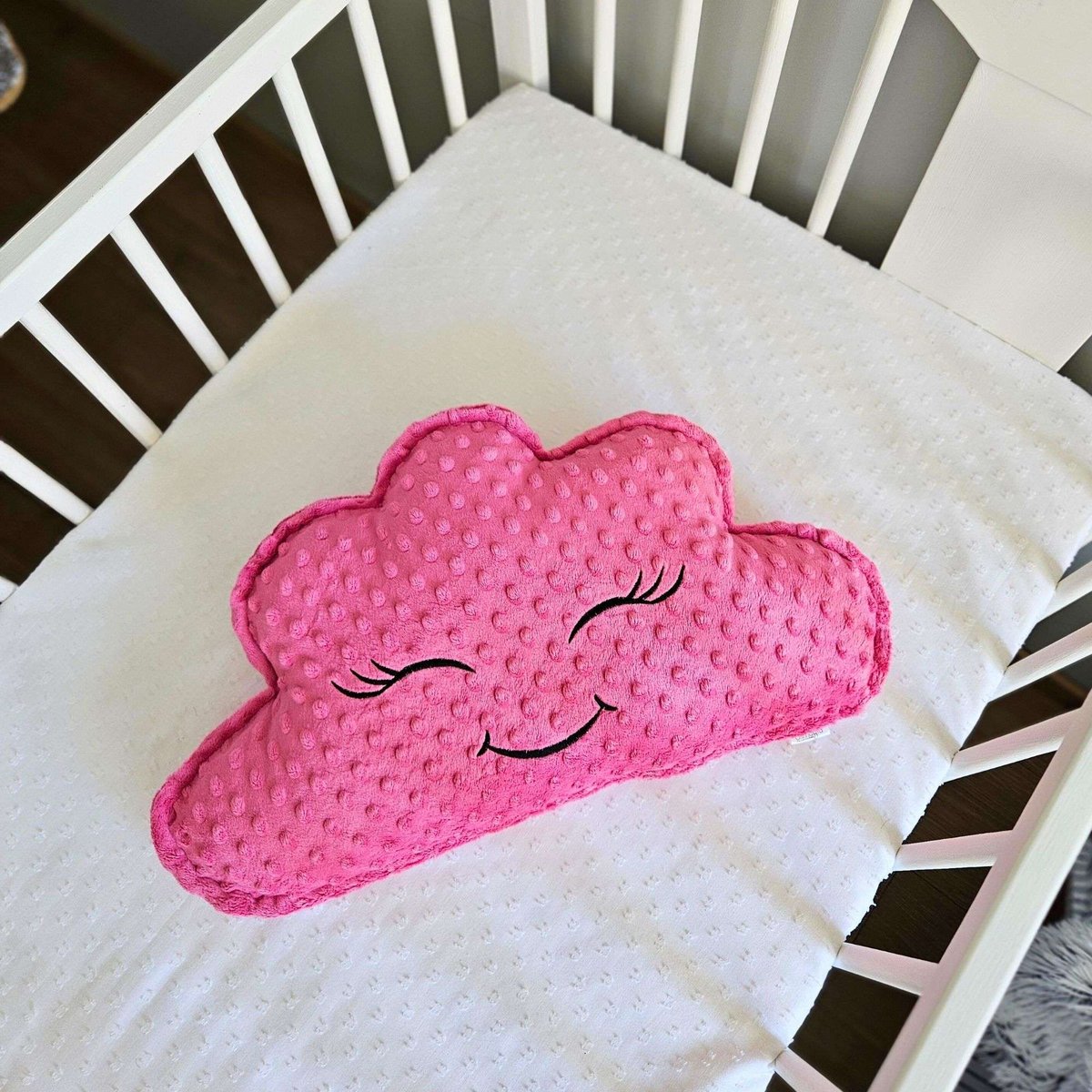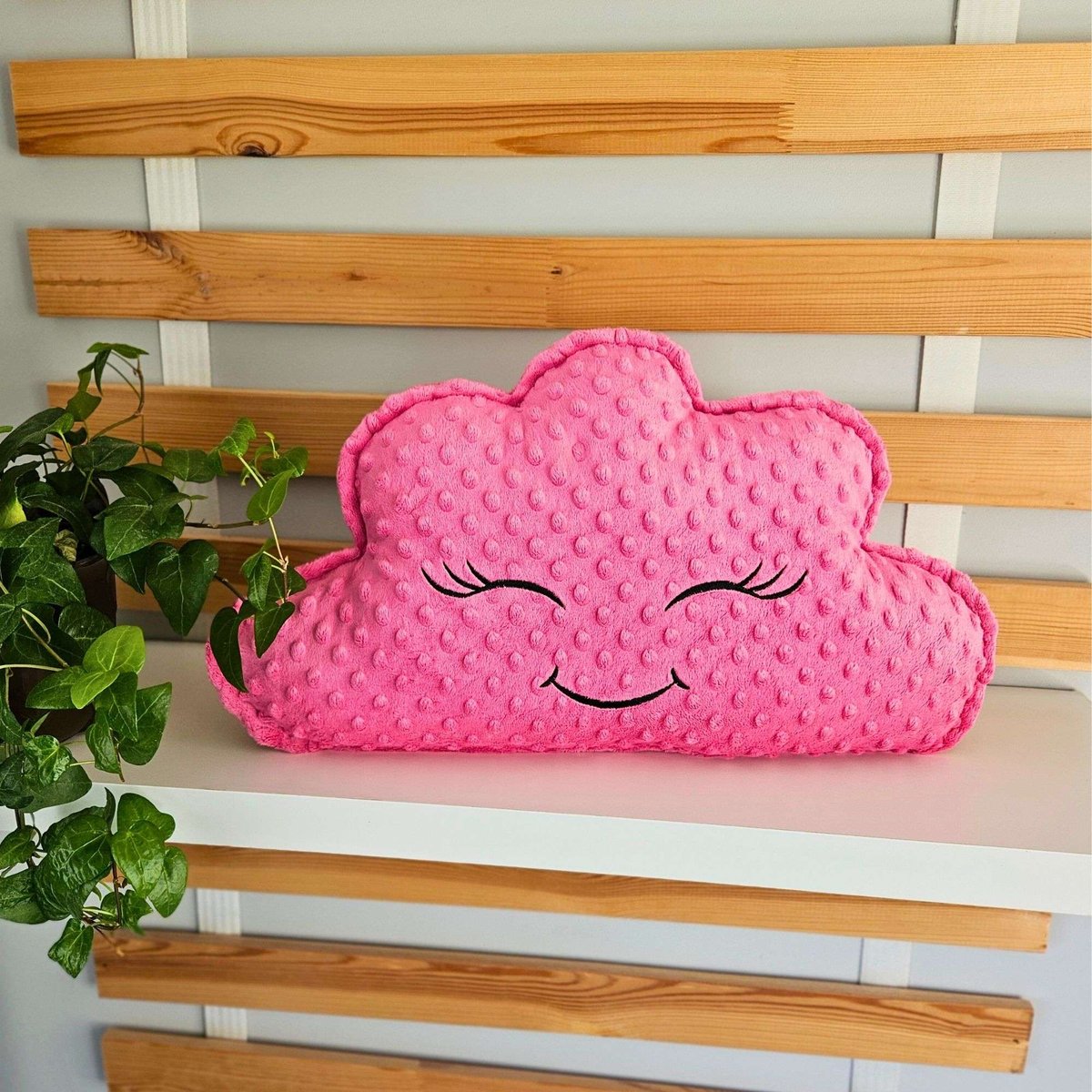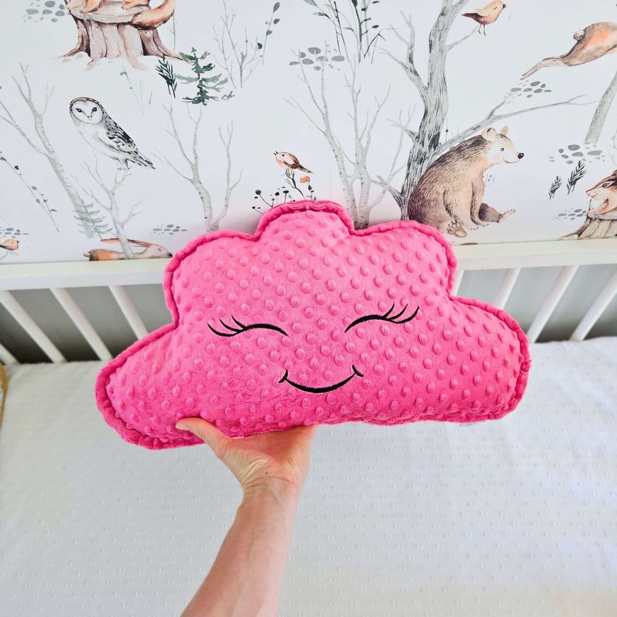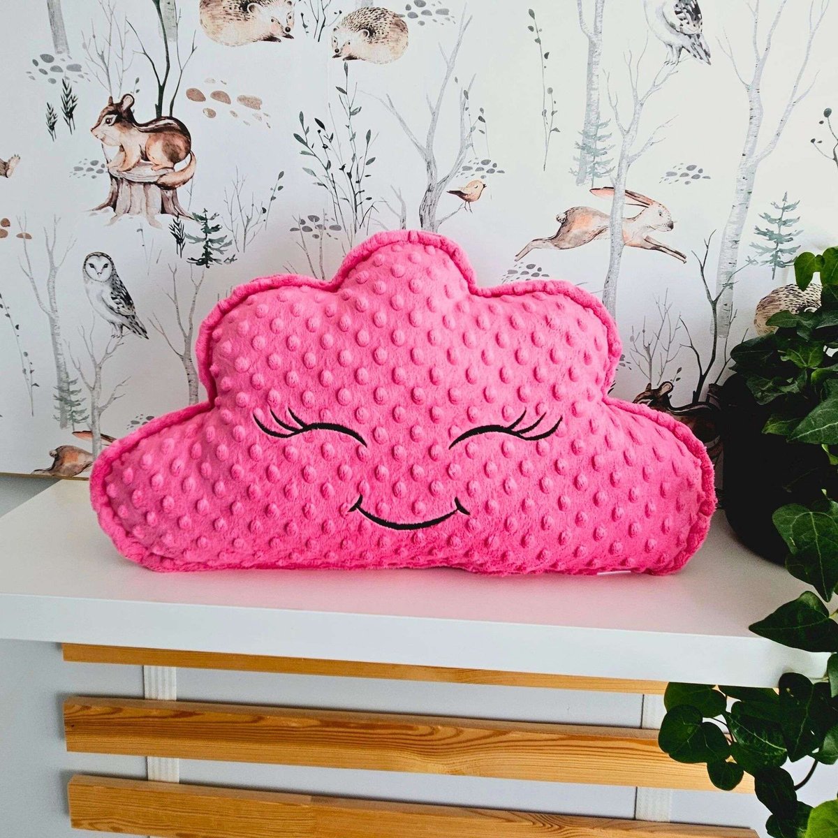 Różowa chmurka z wyhaftowaną twarzą – subtelna ozdoba do wnętrz dziecięcych. Szukasz uroczej ozdoby do pokoju swojego dziecka? ☁️ Różowa poduszka w kształcie chmurki o wymiarach 30x50 cm to doskonały