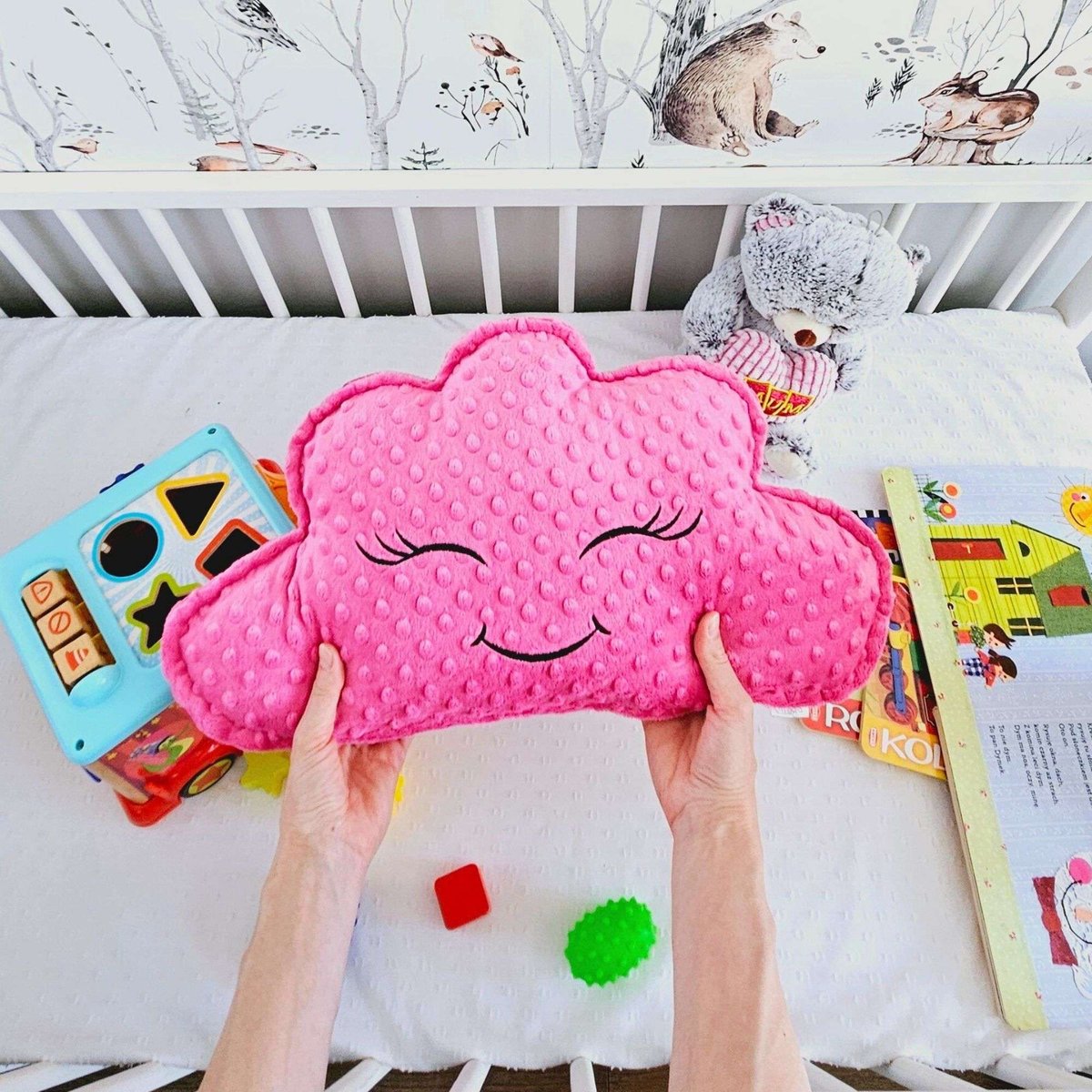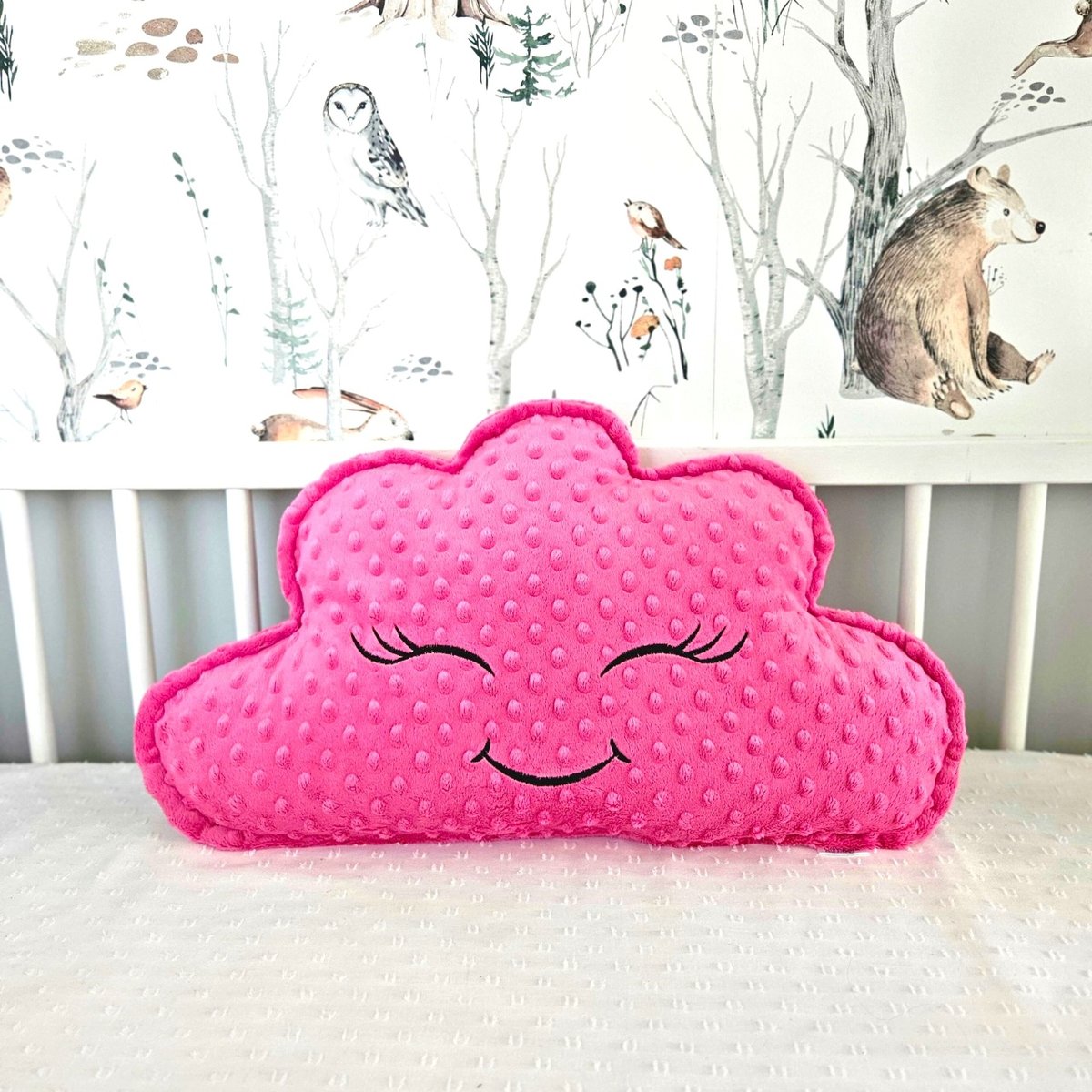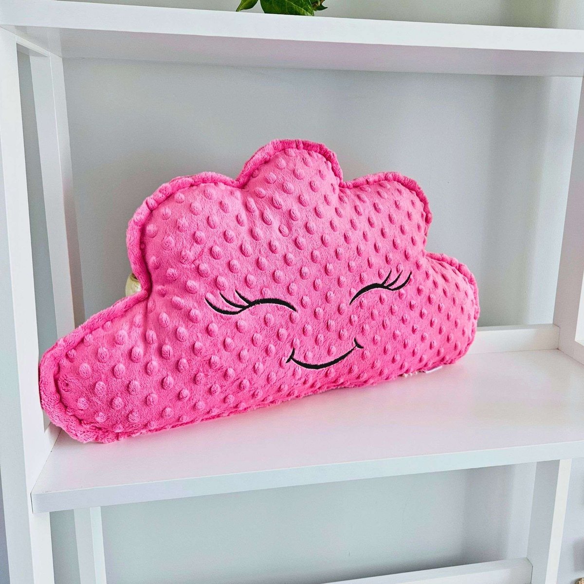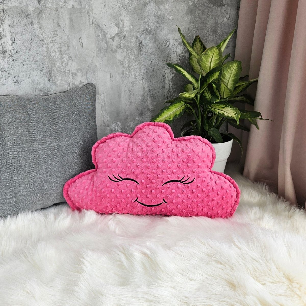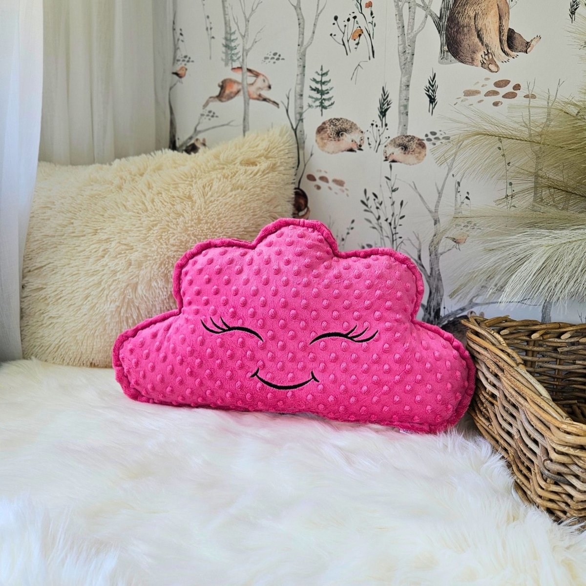 Różowa chmurka z wyhaftowaną twarzą – subtelna ozdoba do wnętrz dziecięcych. Szukasz uroczej ozdoby do pokoju swojego dziecka? ☁️ Różowa poduszka w kształcie chmurki o wymiarach 30x50 cm to doskonały