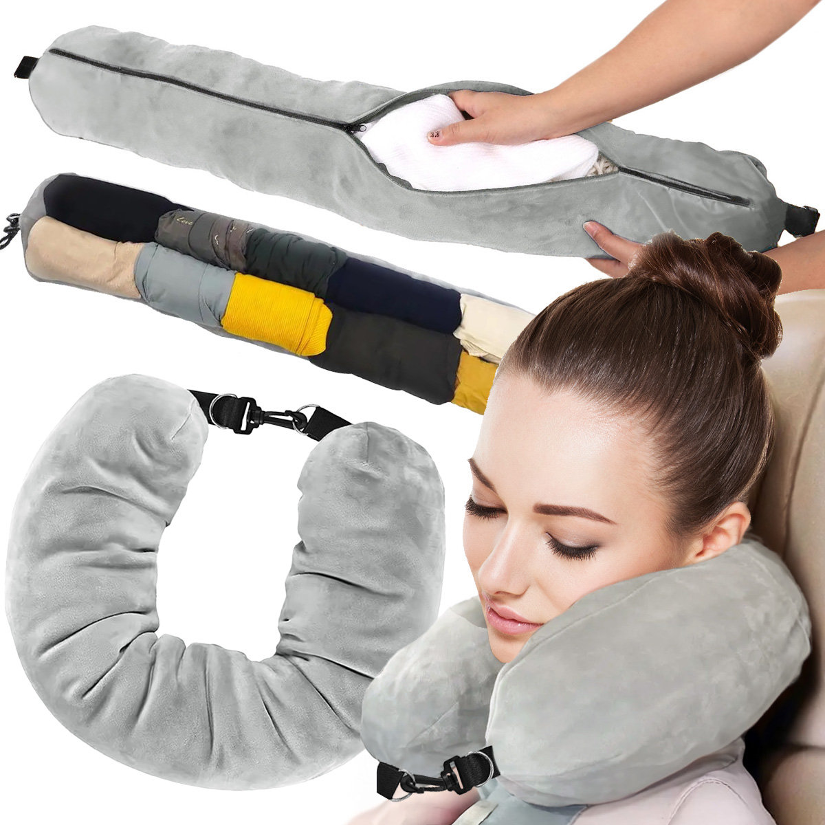 Unikalną cechą poduszki jest schowek zapinany na zamek, w którym można przechowywać odzież. Dzięki temu po wypełnieniu ubraniami, poduszka staje się komfortowym zagłówkiem. To wielofunkcyjne rozwiązanie, które pozwala oszczędzić miejsce w bagażu.