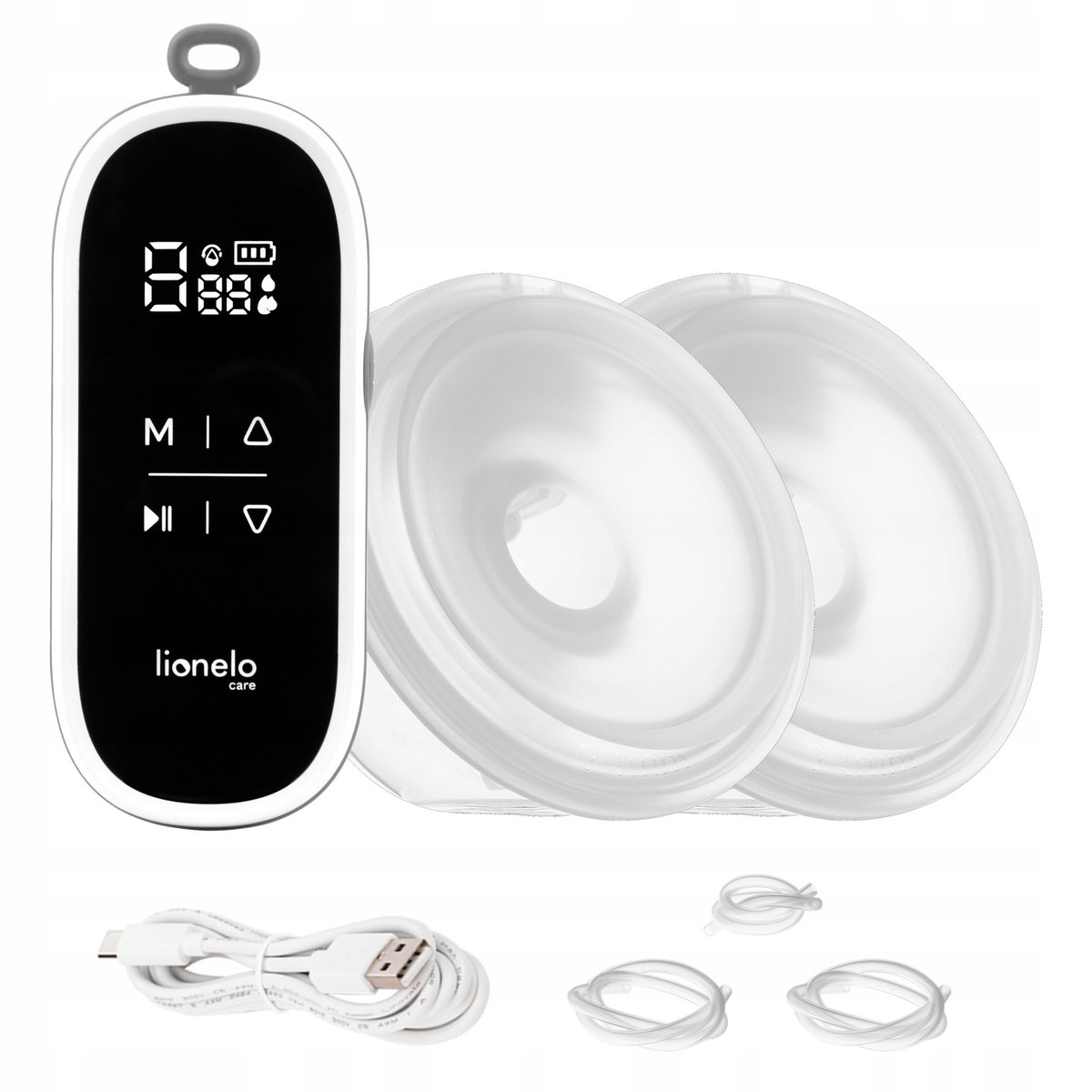 Na czytelnym panelu znajdują się przyciski sterujące. Podczas pracy laktator można zawiesić na dołączonej smyczce lub schować do kieszeni.