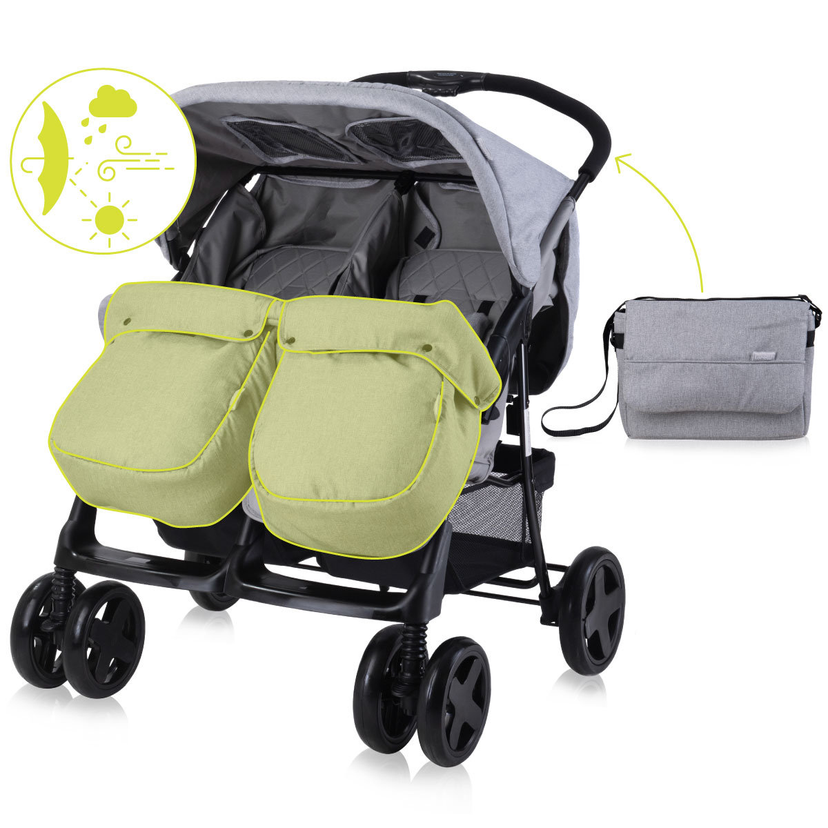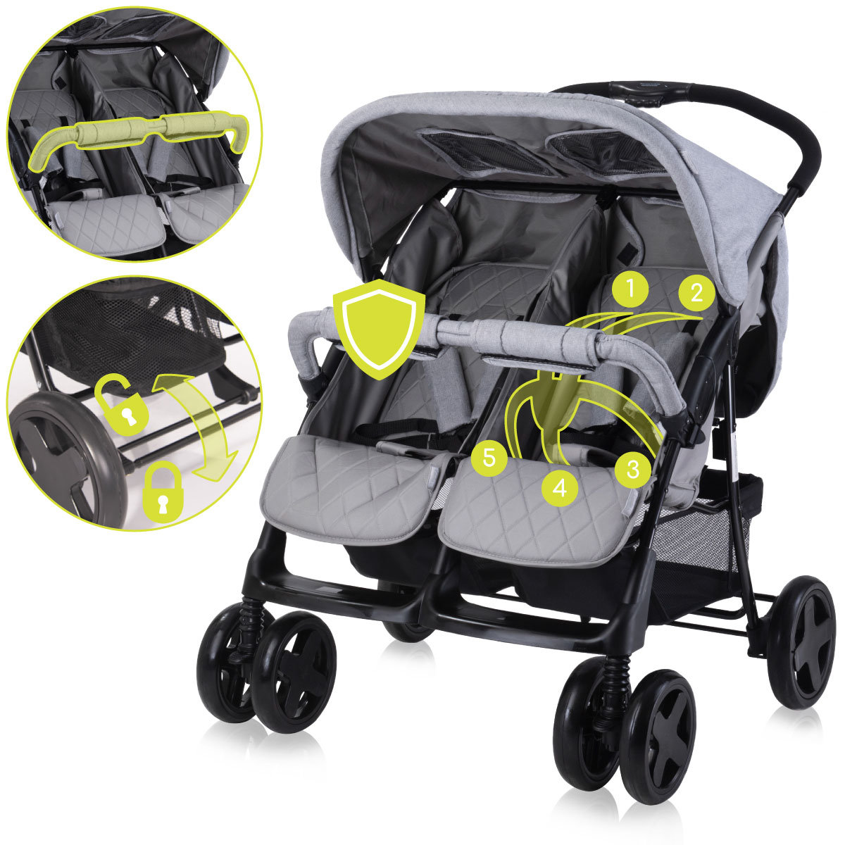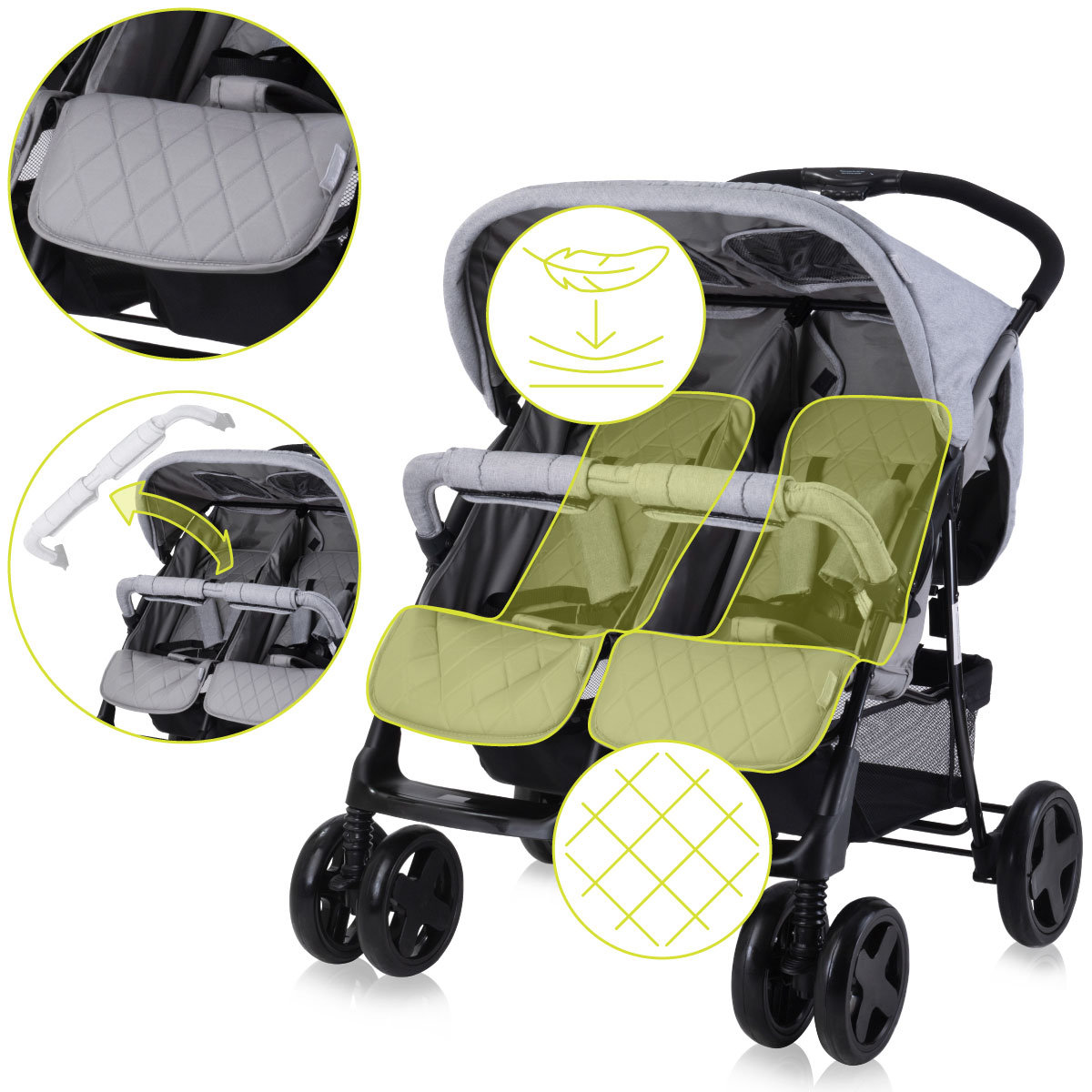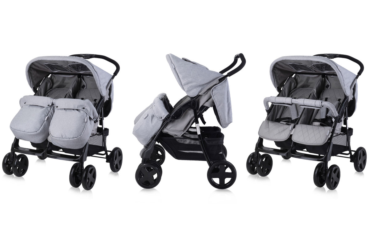 Lorelli Twin to funkcjonalny i elegancki wózek dla dwójki dzieci, który łączy bezpieczeństwo, komfort niezależnego ustawienia i praktyczne rozwiązania, idealny do miejskich spacerów i codziennego użytkowania.Lorelli Twin – komfort dla bliźniąt w eleganckim stylu