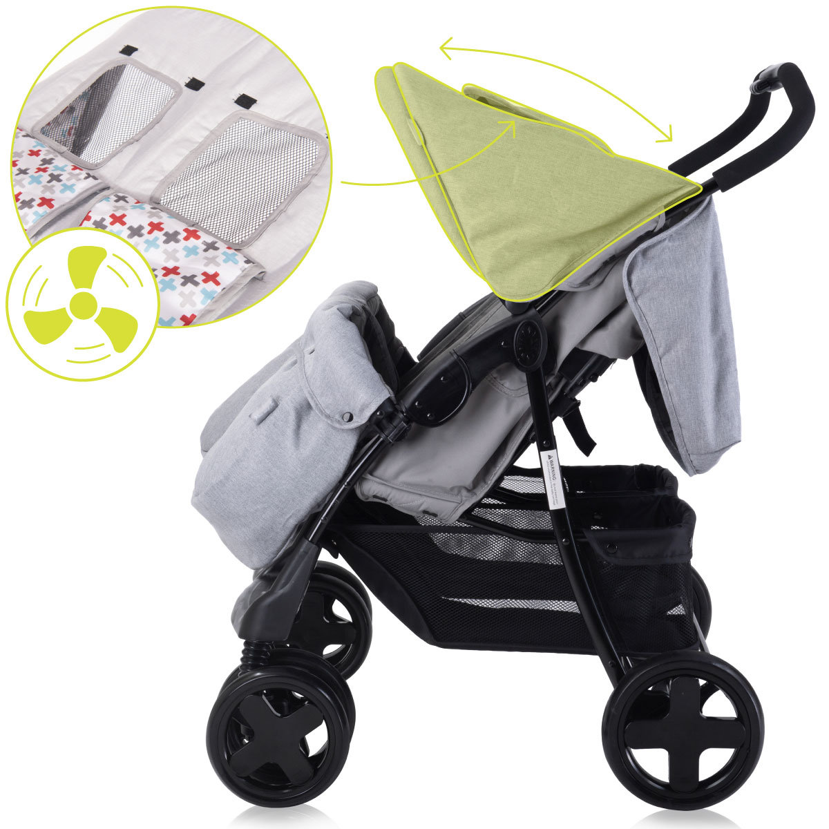 ❇️ Rozsuwany daszek wyposażony w panel wentylacyjny pozwala na dostęp powietrza i kontrolę światła słonecznego, zapewniając komfort pasażeromDaszek z siatką wentylacyjną chroniący przed słońcem
