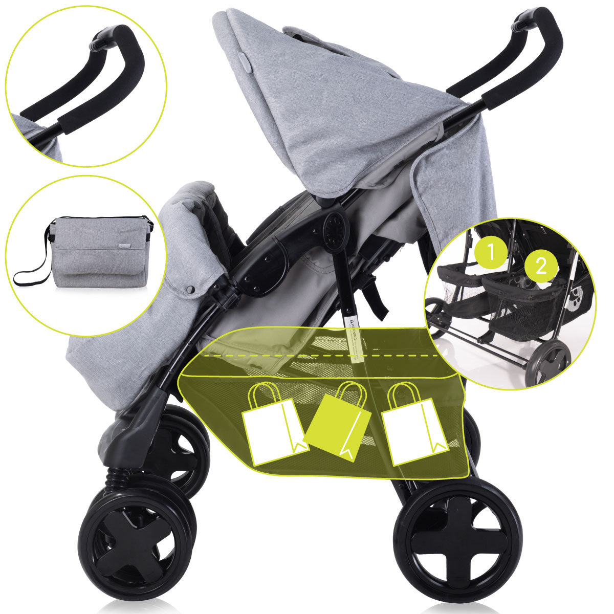 ❇️ Pod wózkiem znajduje się pojemny kosz na zakupy, który pomieści torbę, akcesoria dziecięce lub zakupy – zwiększa praktyczność codziennego użytkowania, szczególnie przy dwójce dzieci ❇️ Wózek posiada w zestawie torbę dla mamy na potrzebne drobiazgi i akcesoria dla dzieci Duży kosz na zakupy i torba