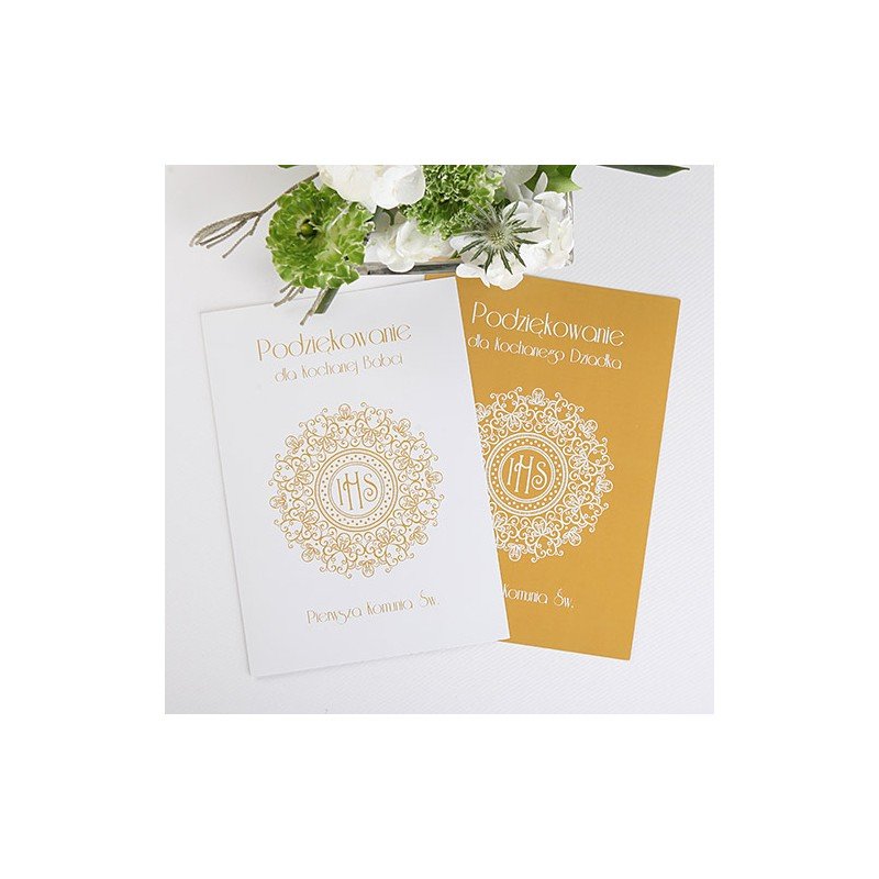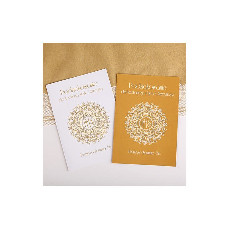 - podziękowanie dla Babci oraz Matki Chrzestnej jest wykonane na białym tle ze złotymi elementami, a dla Ojca Chrzestnego oraz Dziadka na złotym tle z białymi elementami