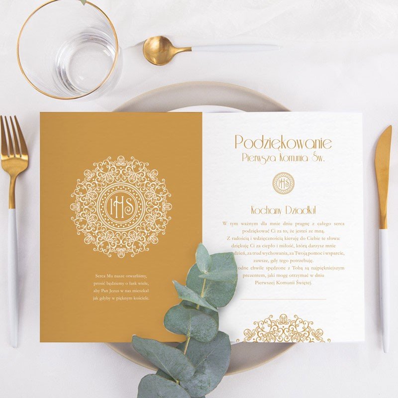 podziękowania mają elegancki, a jednocześnie nowoczesny wzór ornamentowej hostii