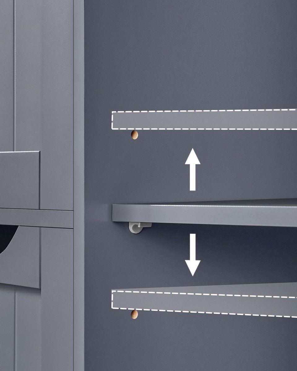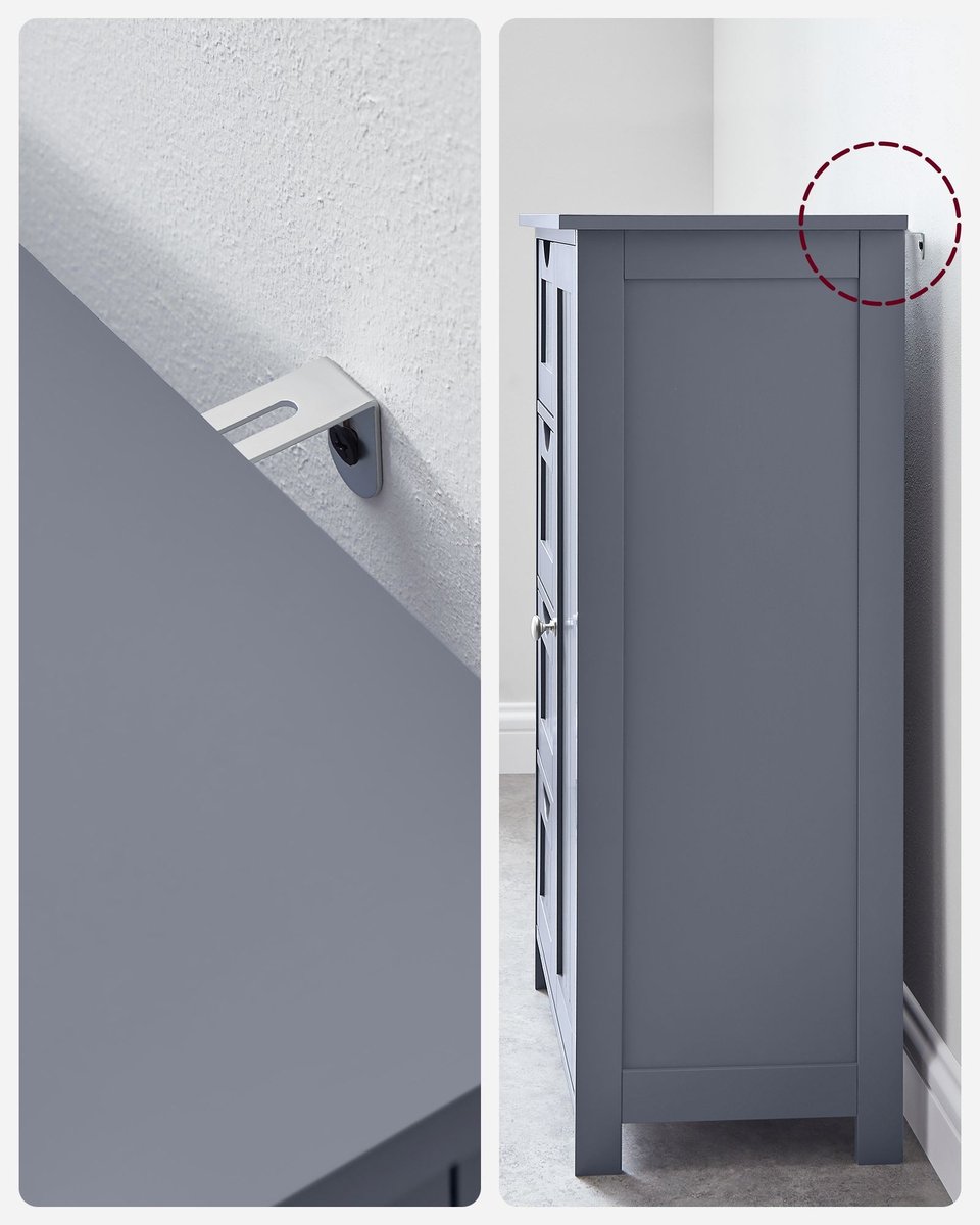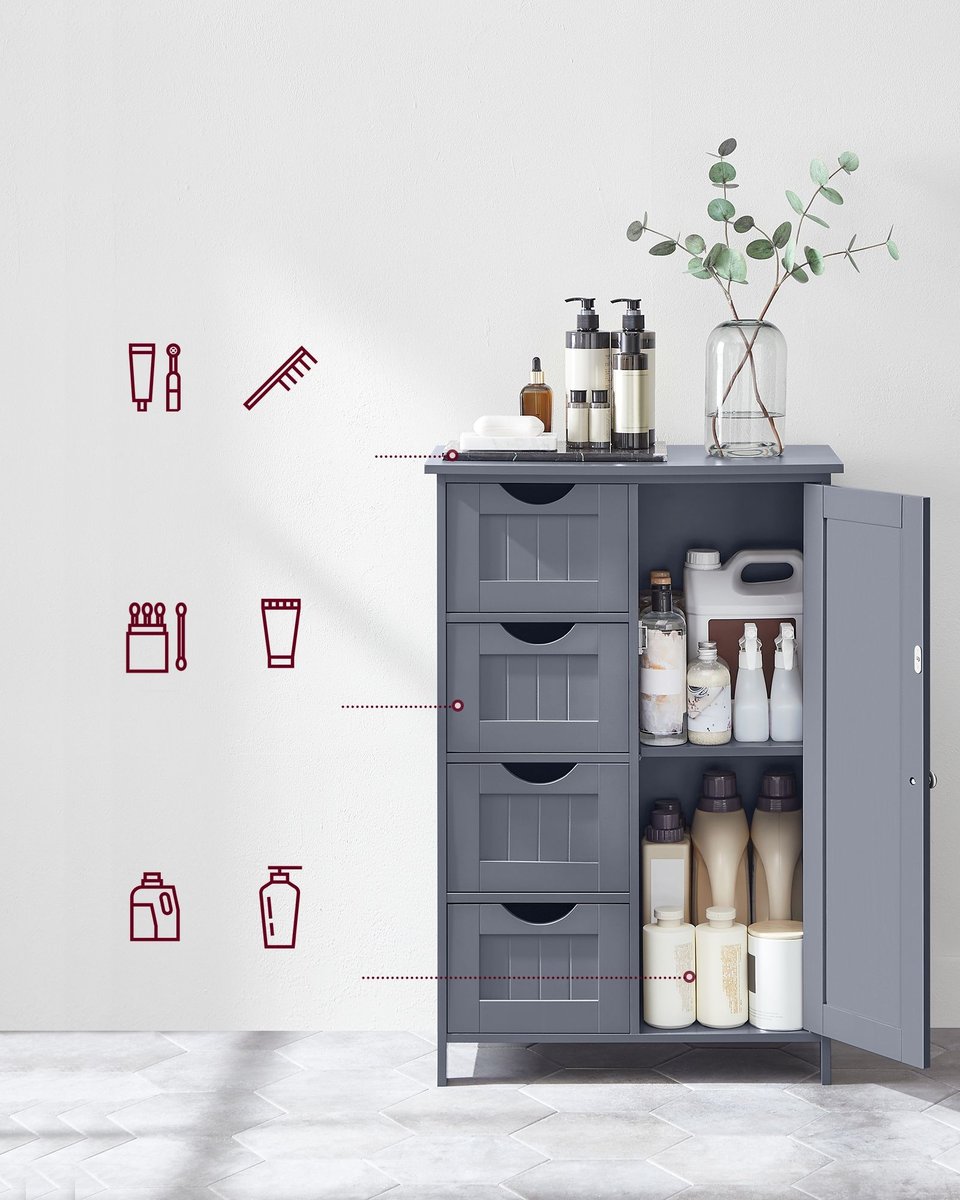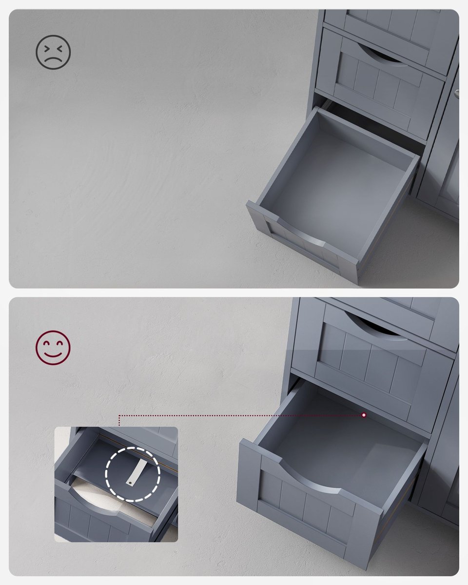 Wąska praktyczna szafka wykonana z płyty MDF jest niezastąpionym rozwiązaniem dla osób, które nie tylko cenią sobie porządek wokół siebie, ale zależy im na wyjątkowym dopełnieniu designu w swojej łazience. Pojemne 4 szuflady i regulowana półka na 3 wysokościach za drzwiami zapewnią elastyczność w organizowaniu przestrzeni, które pomieszczą kosmetyki, ręczniki czy też inne przedmioty do przechowywania na artykuły higieniczne. Ponadto, jej wolnostojąca forma pozwala na umieszczenie w dowolnym miejscu, by sprostać potrzebom przechowywania w danym pomieszczeniu, a dołączony zestaw zapobiegający upadkom zagwarantuje bezpieczeństwo. Szafka ta nie tylko oferuje dużą pojemność, ale także prezentuje elegancki wygląd w szarym kolorze, który pasuje do wielu aranżacji wnętrz dodając industrialny akcent.