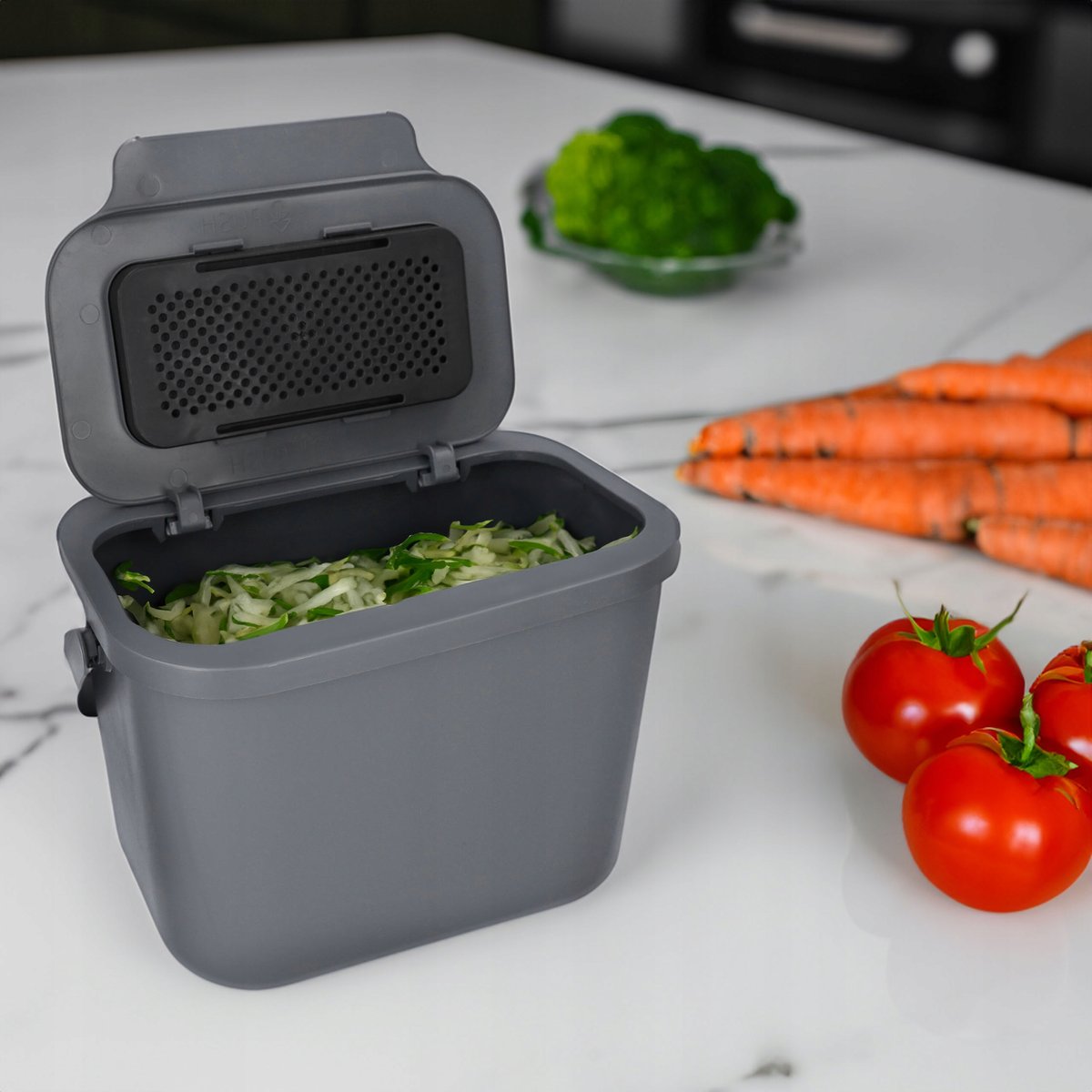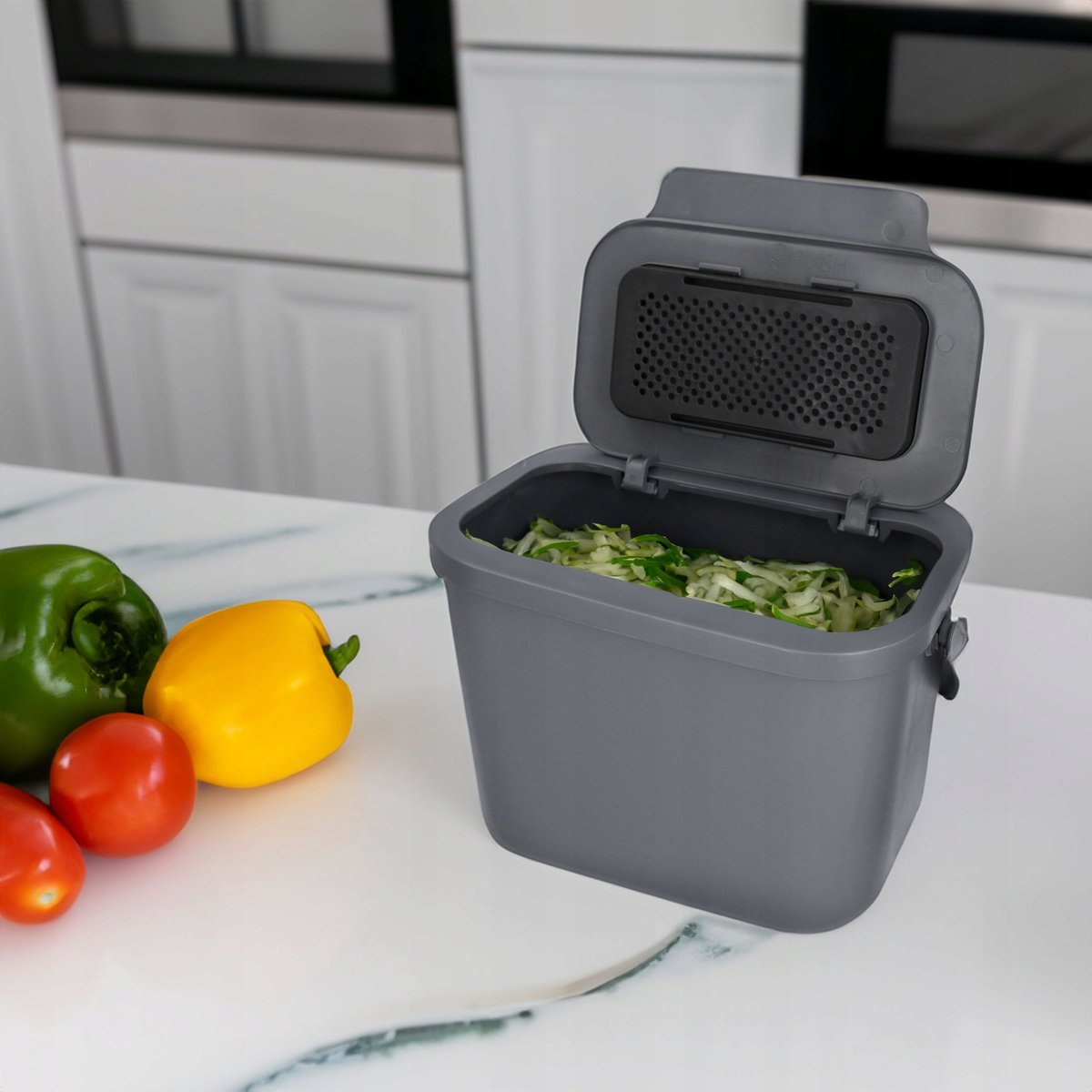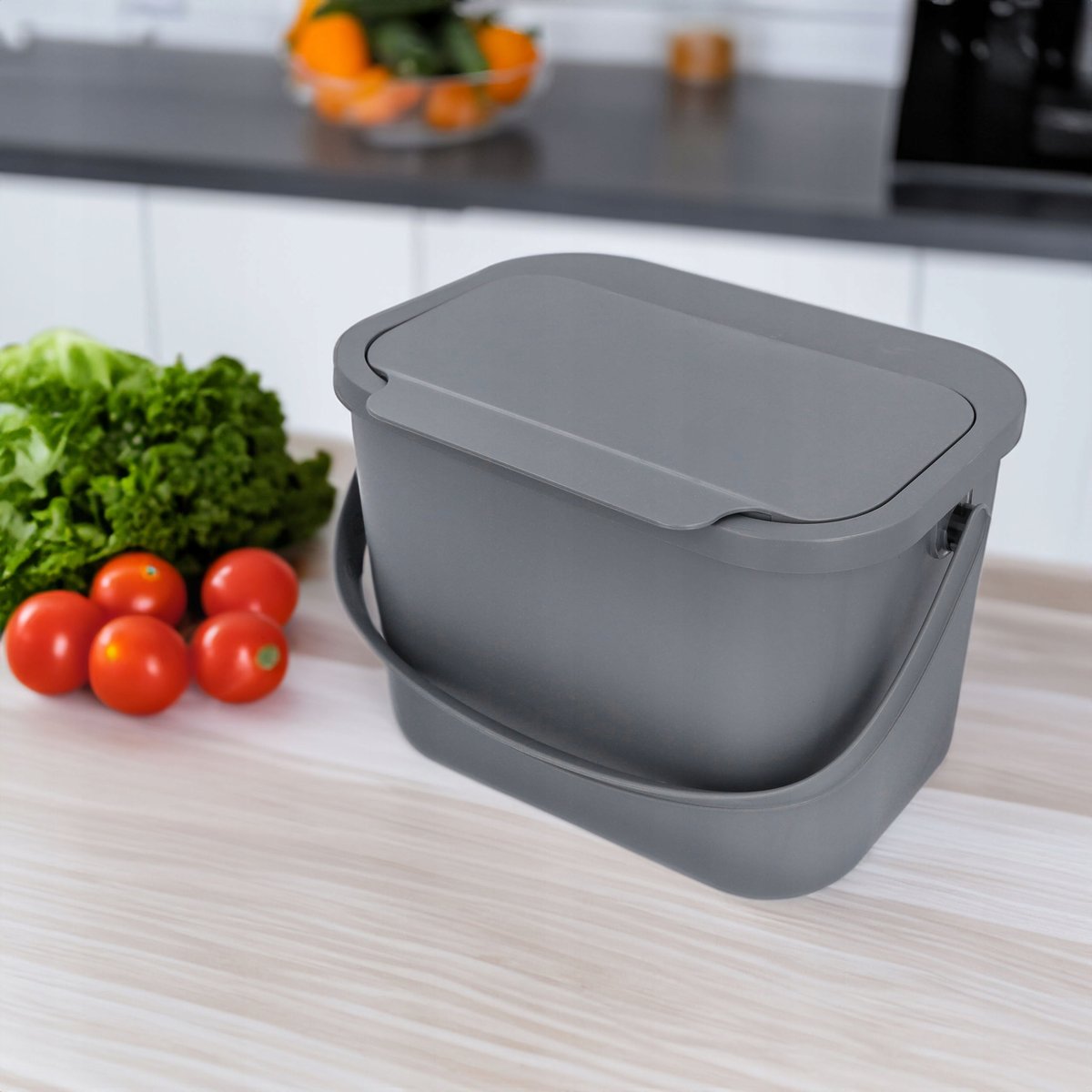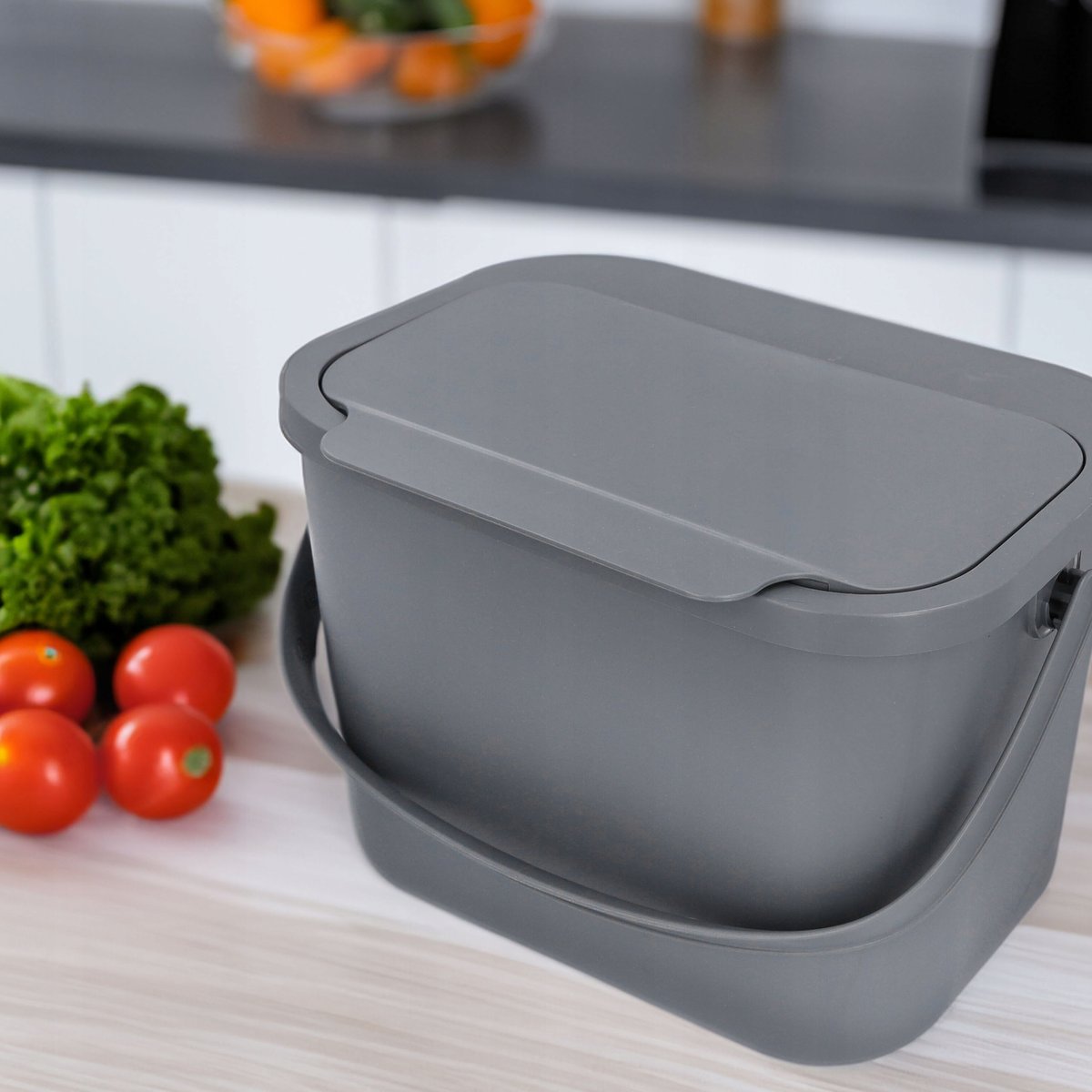 Nasz pojemnik Mini Bini sprawdzi się jako podręczny kompostownik do przechowywania resztek jedzenia i roślinnych odpadków. Przygotowany do przenoszenia ich do zewnętrznego kompostownika, ułatwia segregację bioodpadów w domu.