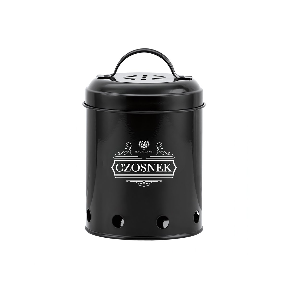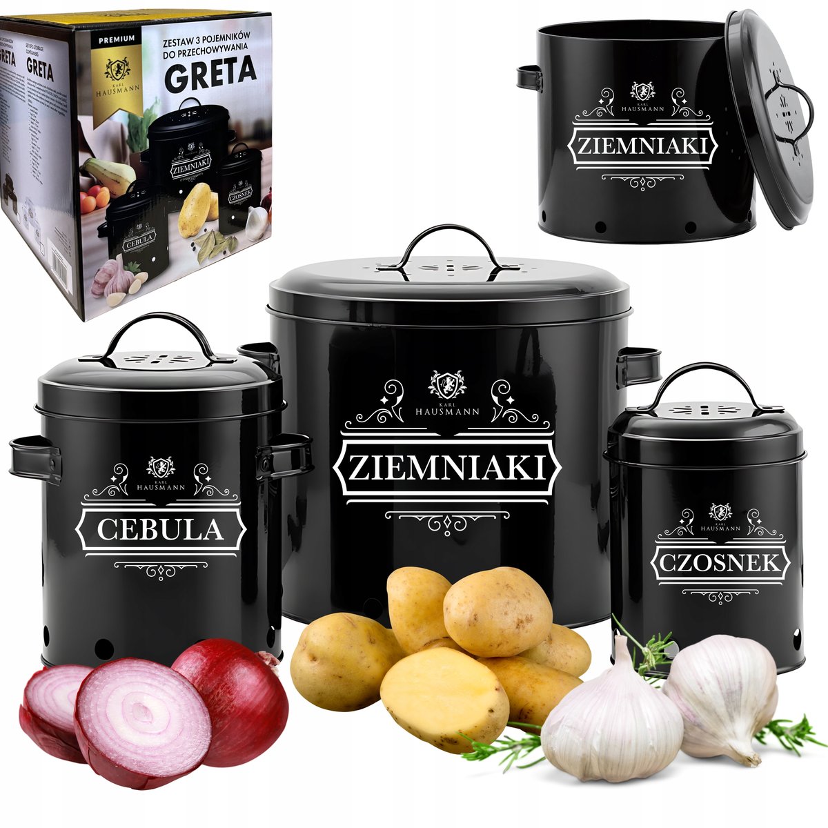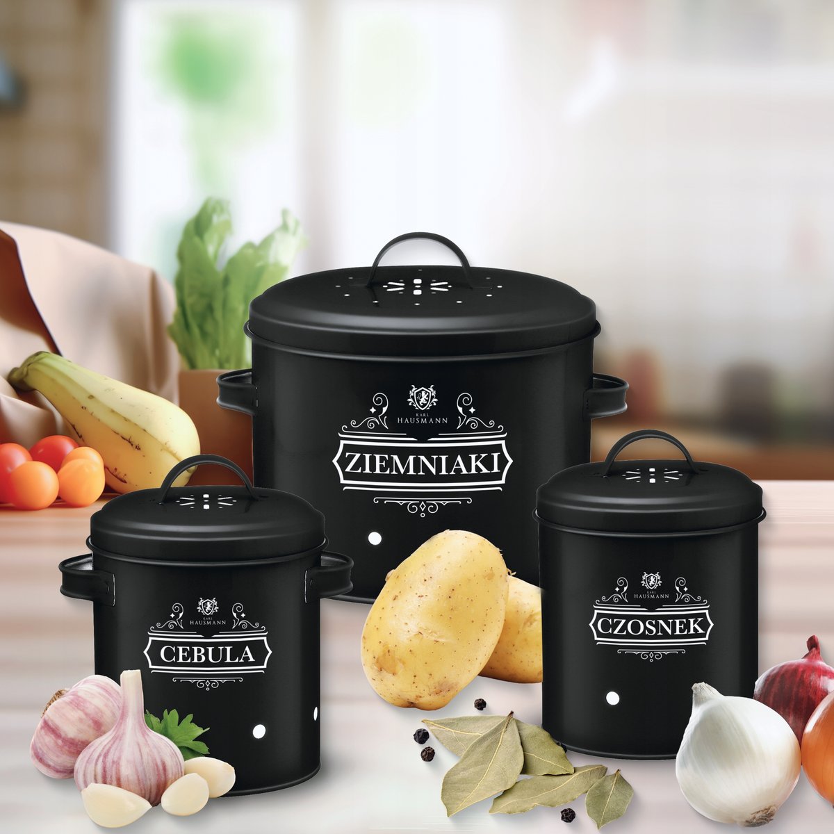 Zestaw trzech pojemników do przechowywania, wykonanych ze stali nierdzewnej - malowanych proszkowo w kolorze czarnym. Pojemniki z napisami: ZIEMNIAKI, CEBULA oraz CZOSNEK są bardzo praktyczne i stanowią doskonałe miejsce do przechowywania w kuchni.