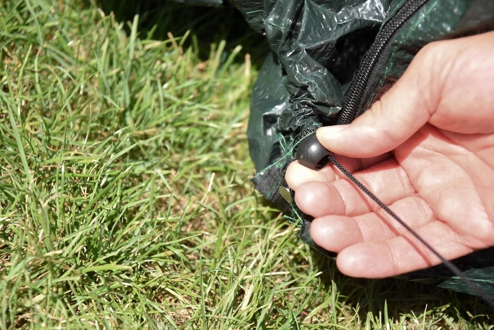 Dwa zamki od frontu ułatwiają założenie pokrowca, a sznurek w dolnej części umożliwia trwałe umocowanie na huśtawce.