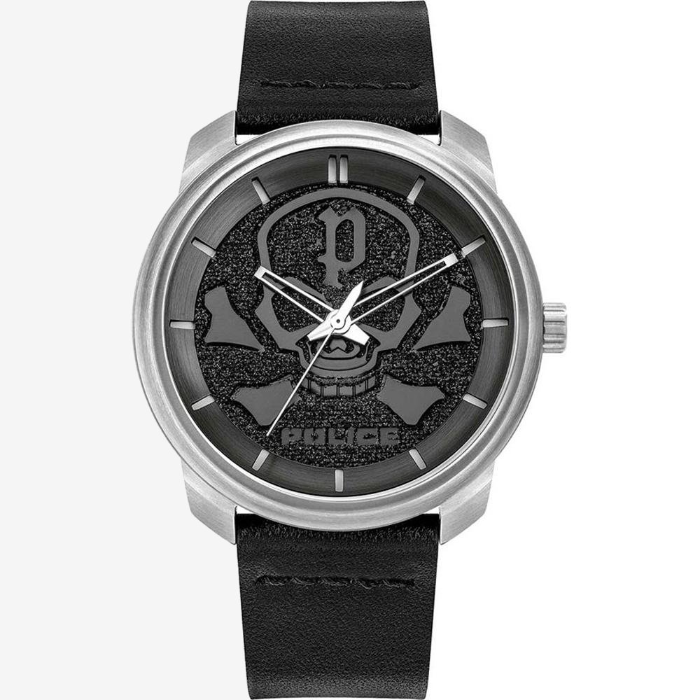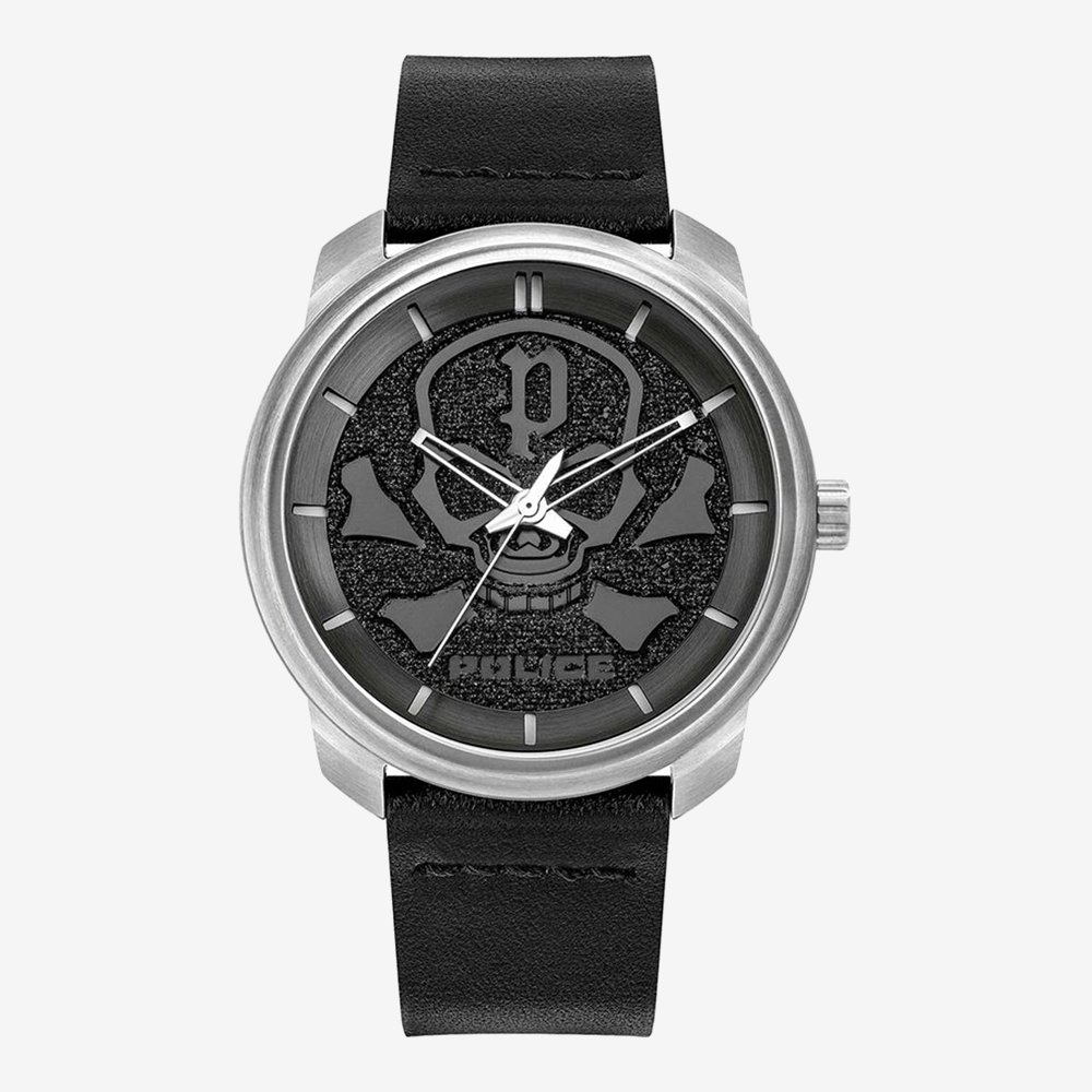 Zegarek męski Police Bleder PL.15714JS/02 Koperta ze stali szlachetnej, srebrna powłoka, matowa Skórzany pasek, czarny, sprzączka Mechanizm kwarcowy, zasilany baterią Wodoodporny Kolor tarczy ...
